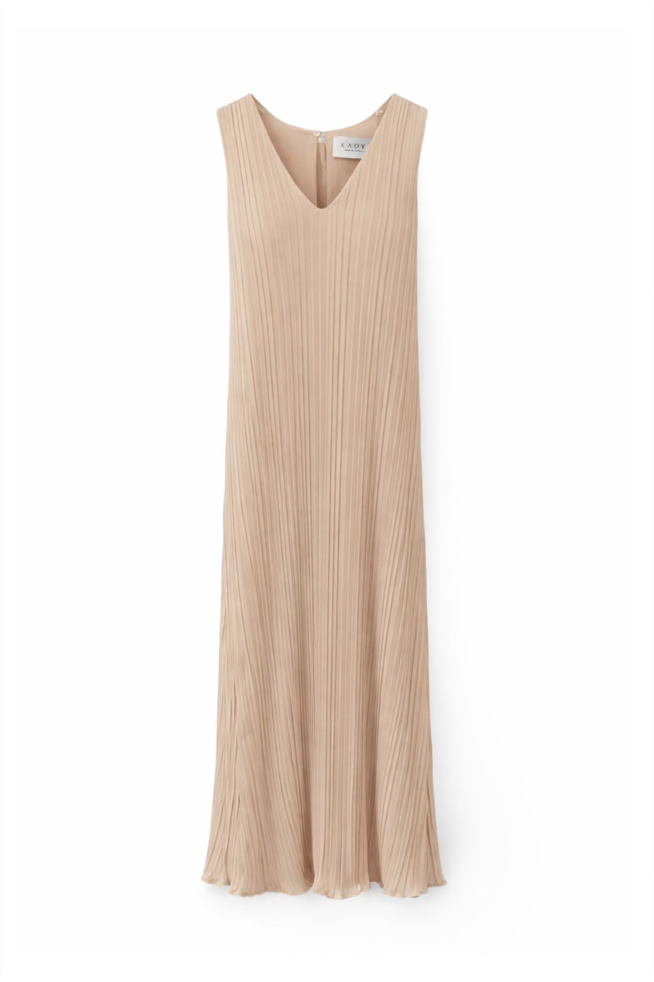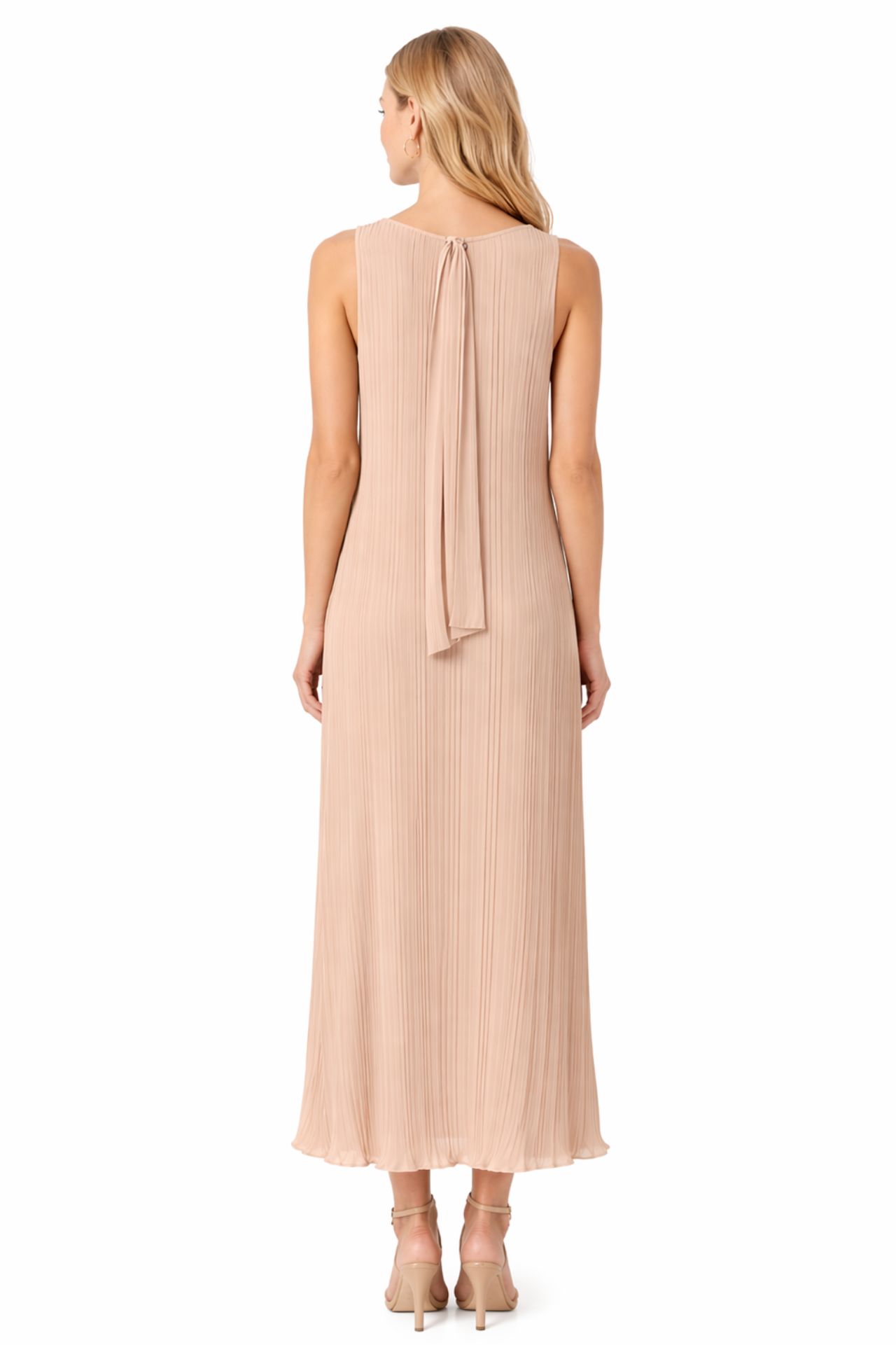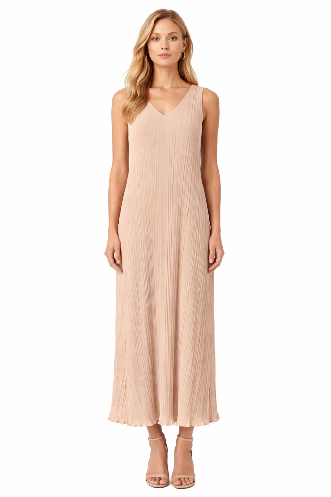Elegancka sukienka maxi w odcieniu beżu to synonim ponadczasowej klasy i nowoczesnej lekkości. Plisowany materiał pięknie układa się w ruchu, a dekolt w kształcie litery V oraz subtelne wiązanie z tyłu dodają jej wyjątkowego, kobiecego charakteru. Ta sukienka premium doskonale sprawdzi się na specjalne okazje, podkreślając styl i elegancję w każdej stylizacji.