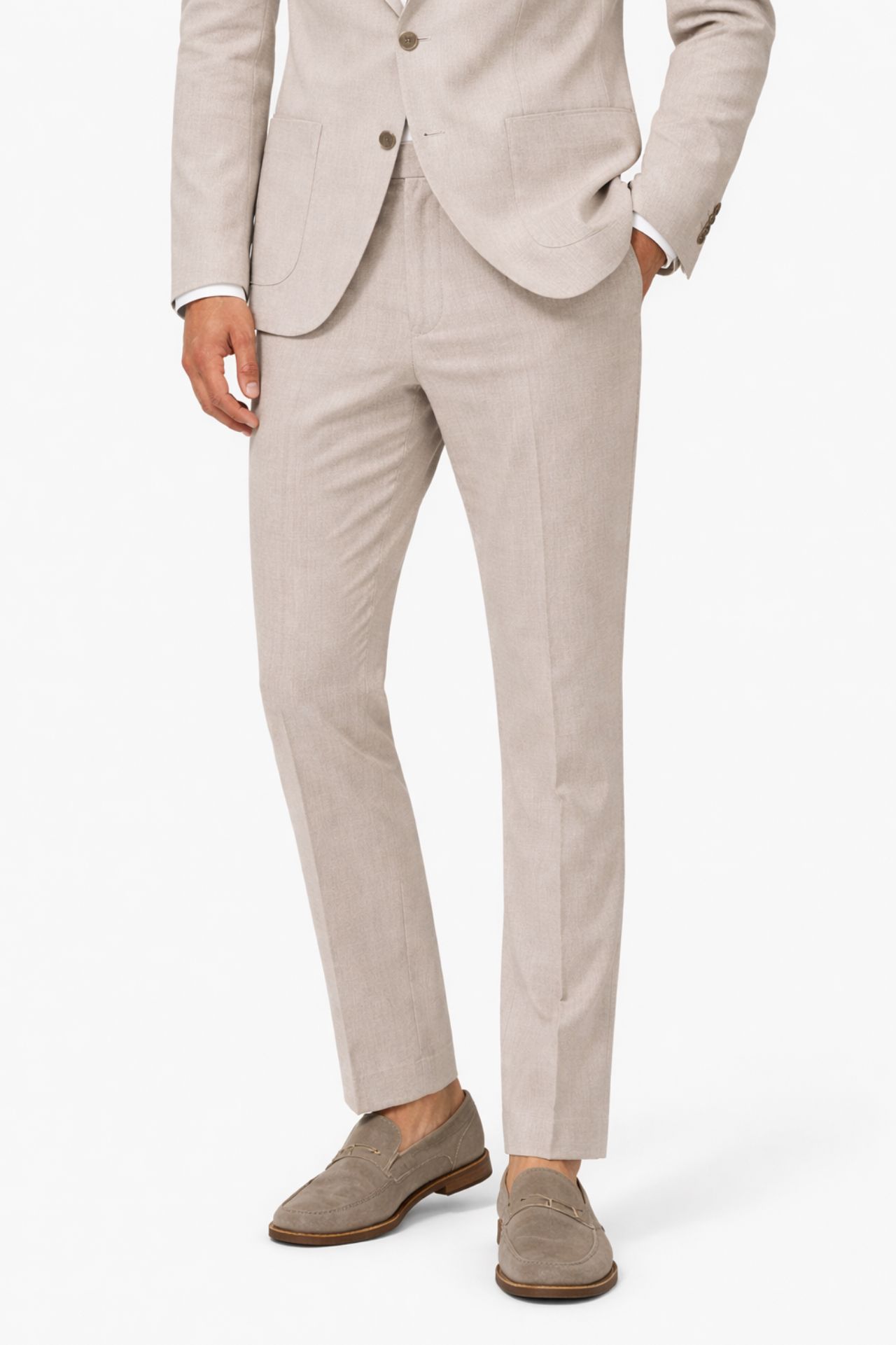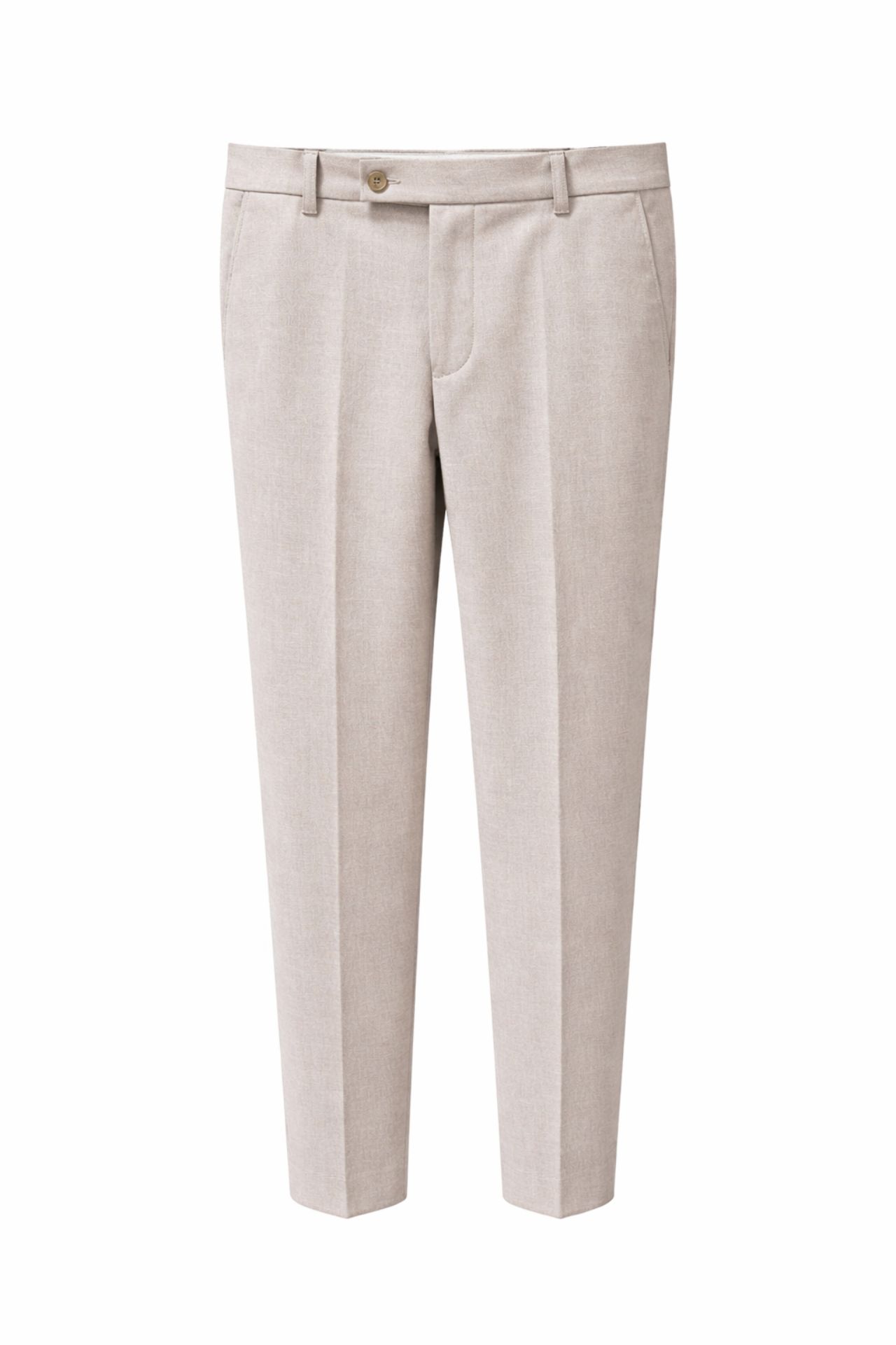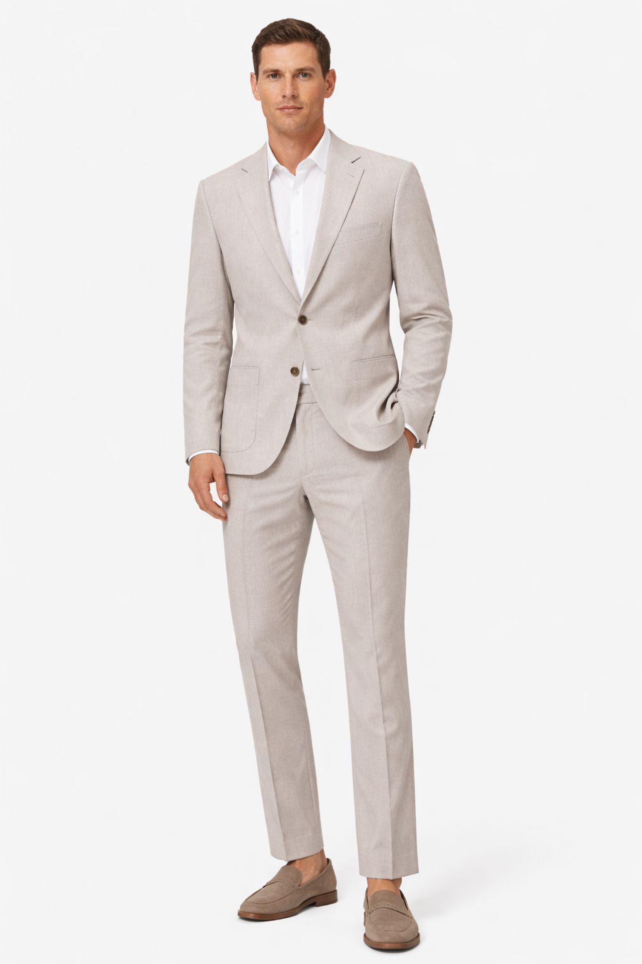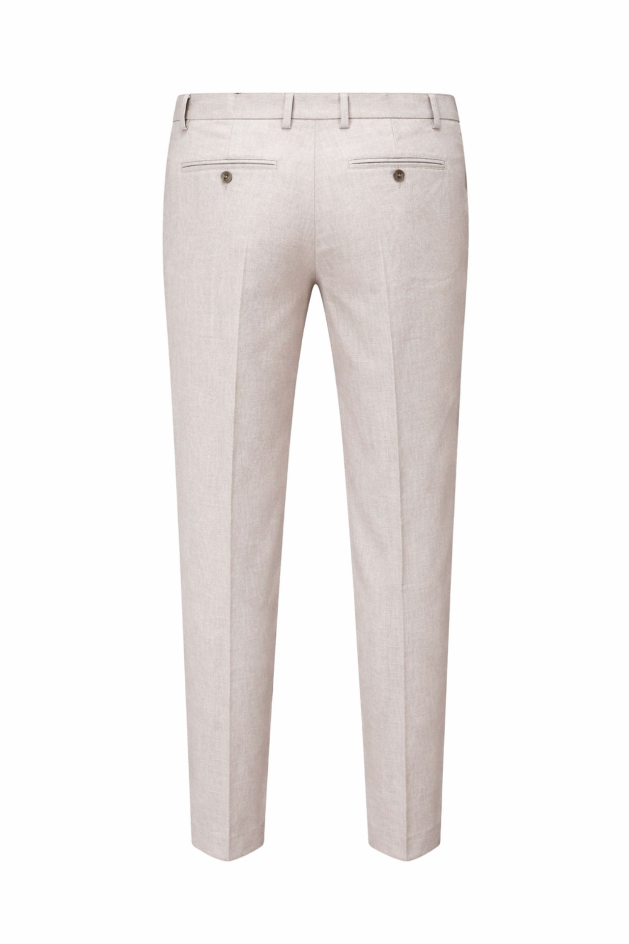 Beżowe spodnie garniturowe z linii premium stanowią stylową podstawę zestawów biznesowych i okazjonalnych, a z marynarką o kodzie produktu 024098 tworzą spójny komplet. Uszyte z wysokiej jakości tkaniny będącej połączeniem lnu i bawełny z dodatkiem elastanu, dzięki czemu oferują lekkość, przewiewność i elegancki, naturalny charakter. Taka kompozycja materiałów wpływa także na wygodę noszenia, elastyczność oraz dobre układanie się na sylwetce. To ponadczasowy model, który pozwala stworzyć dopracowany garnitur premium na wiele okazji i na długi czas.