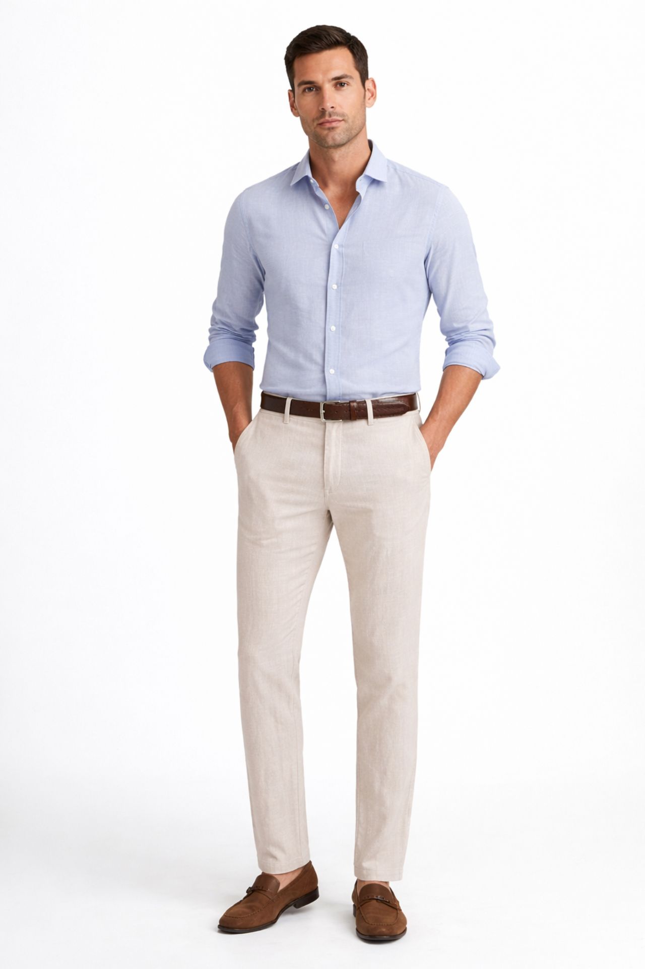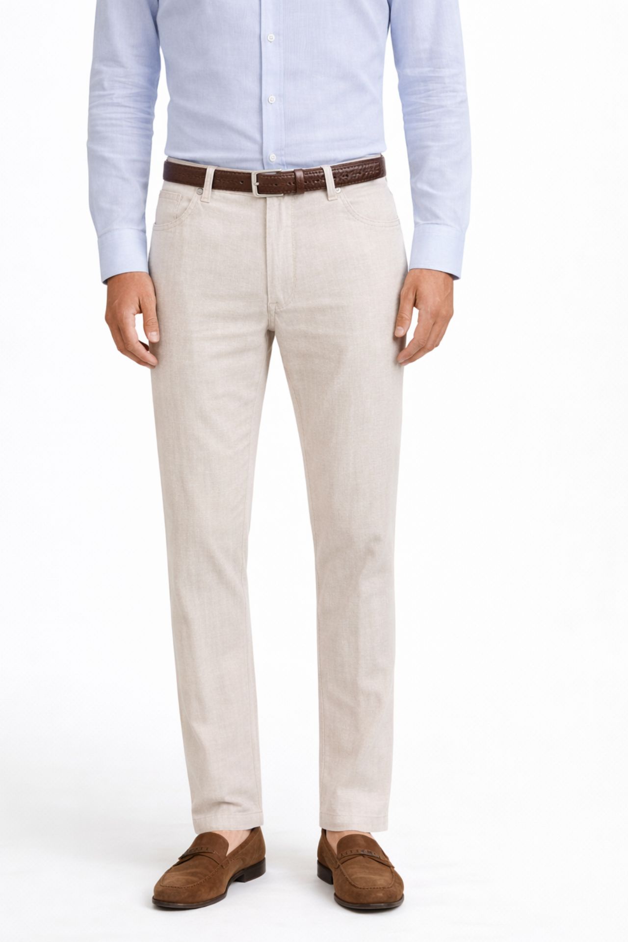 Jasne spodnie męskie wykonane z naturalnej mieszanki lnu i bawełny gwarantują wyjątkowy komfort oraz oddychalność w sezonie wiosenno-letnim. Zwężany fason nadaje sylwetce nowoczesny, elegancki wygląd, jednocześnie zachowując swobodę ruchów. Uniwersalny beżowy kolor sprawia, że model świetnie komponuje się z wieloma elementami garderoby, tworząc stylowe zestawy premium.