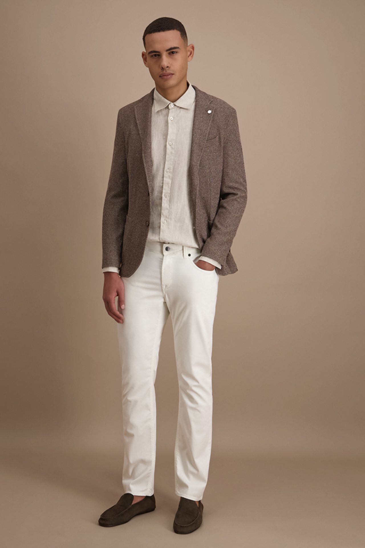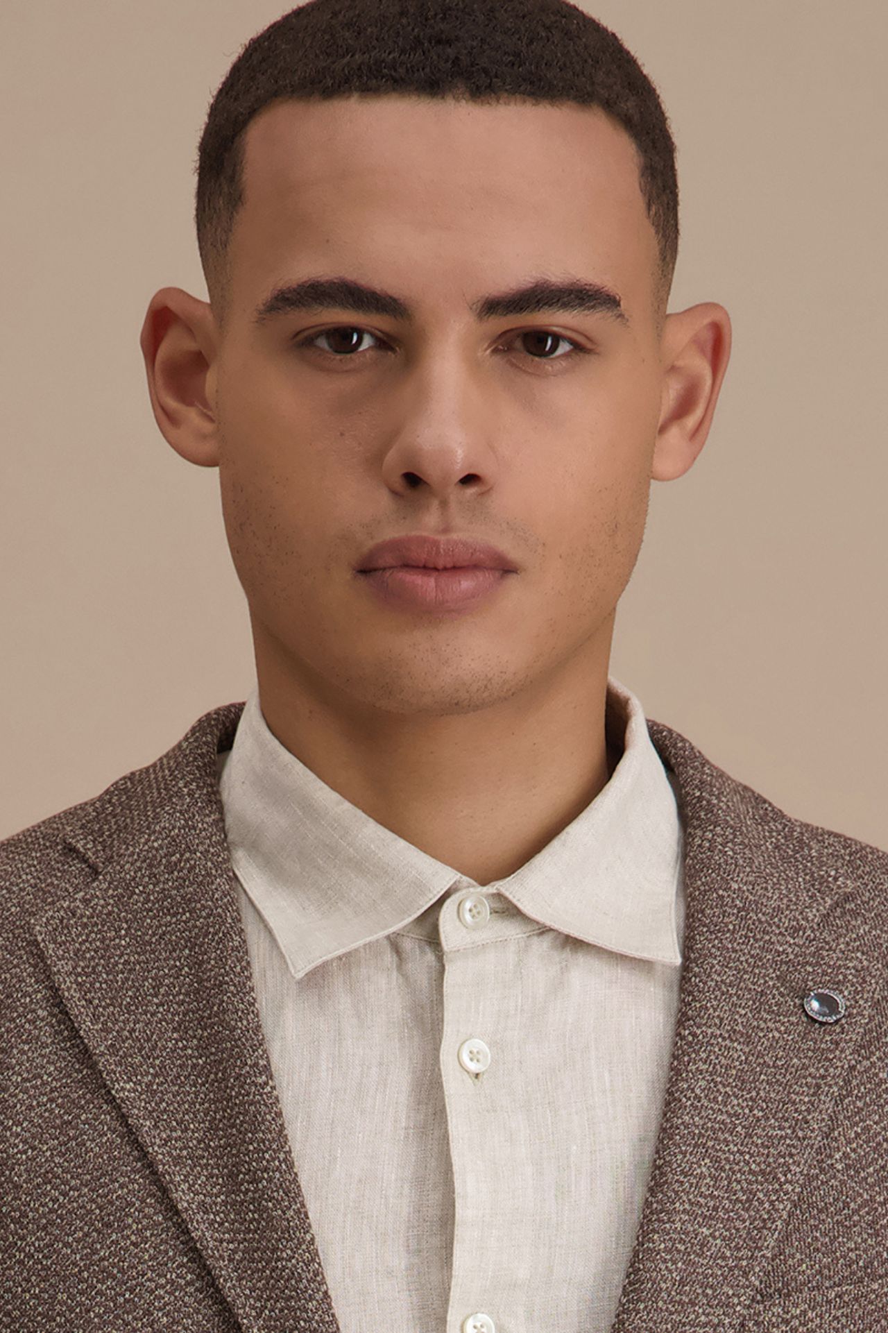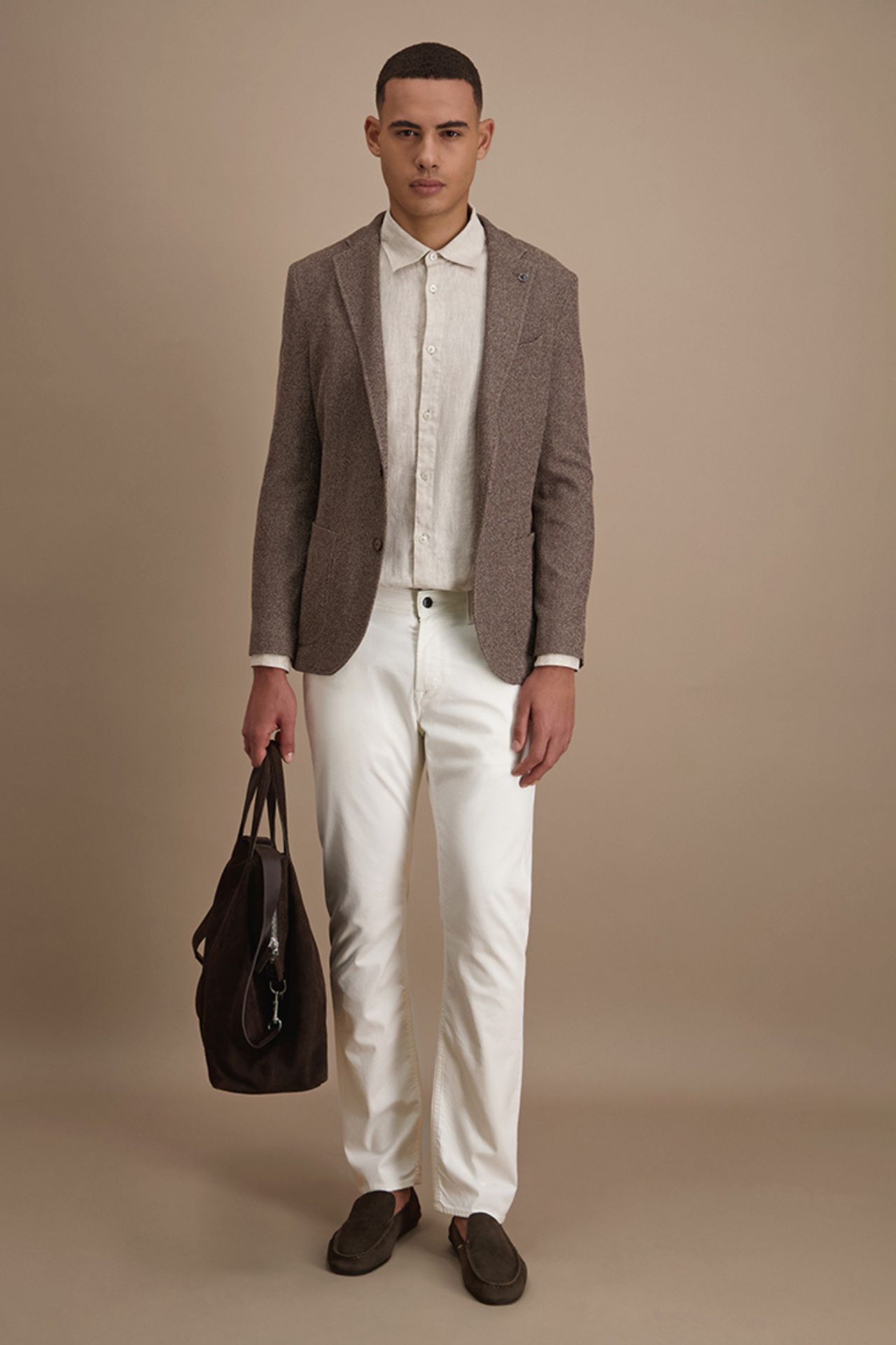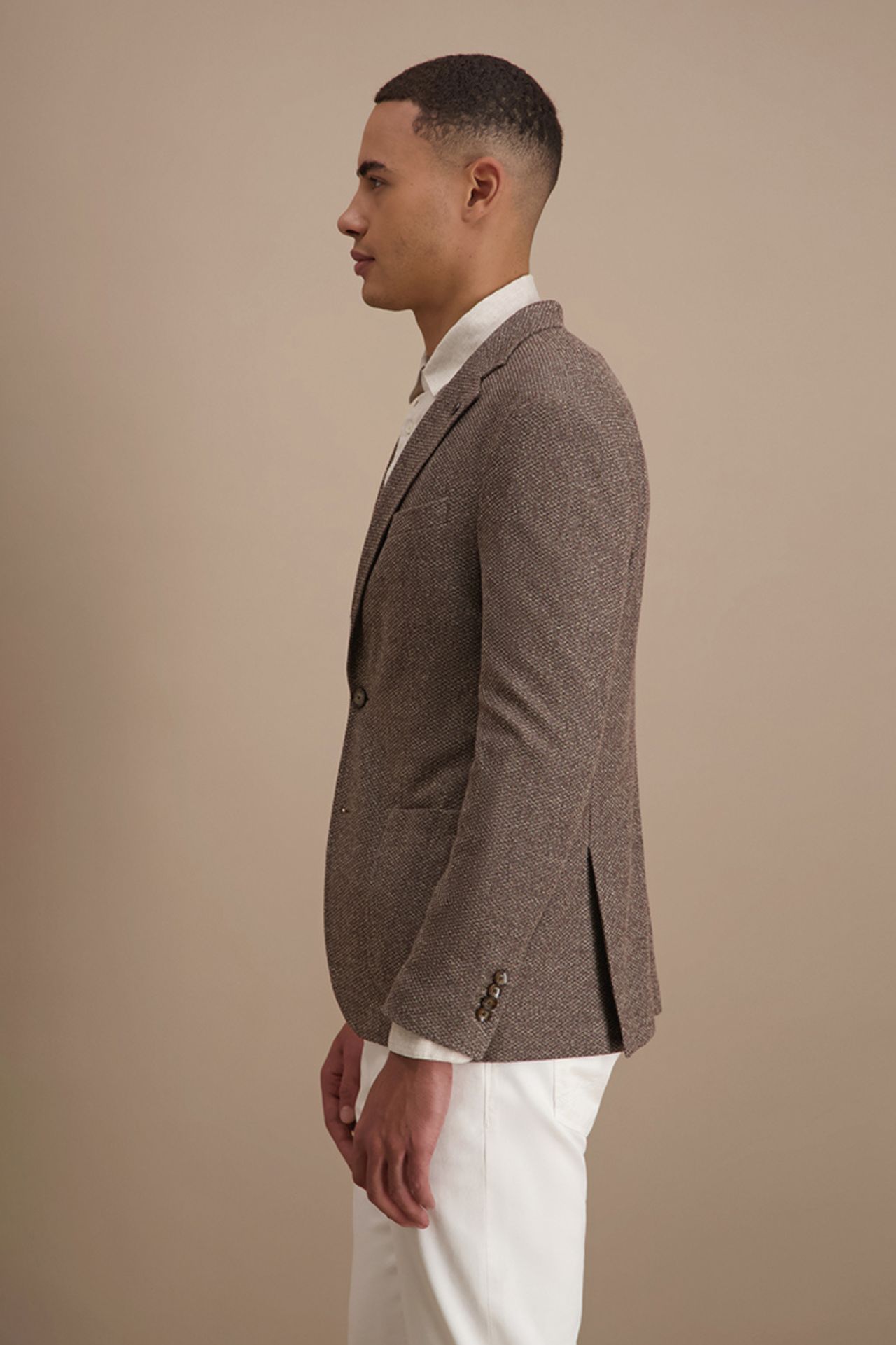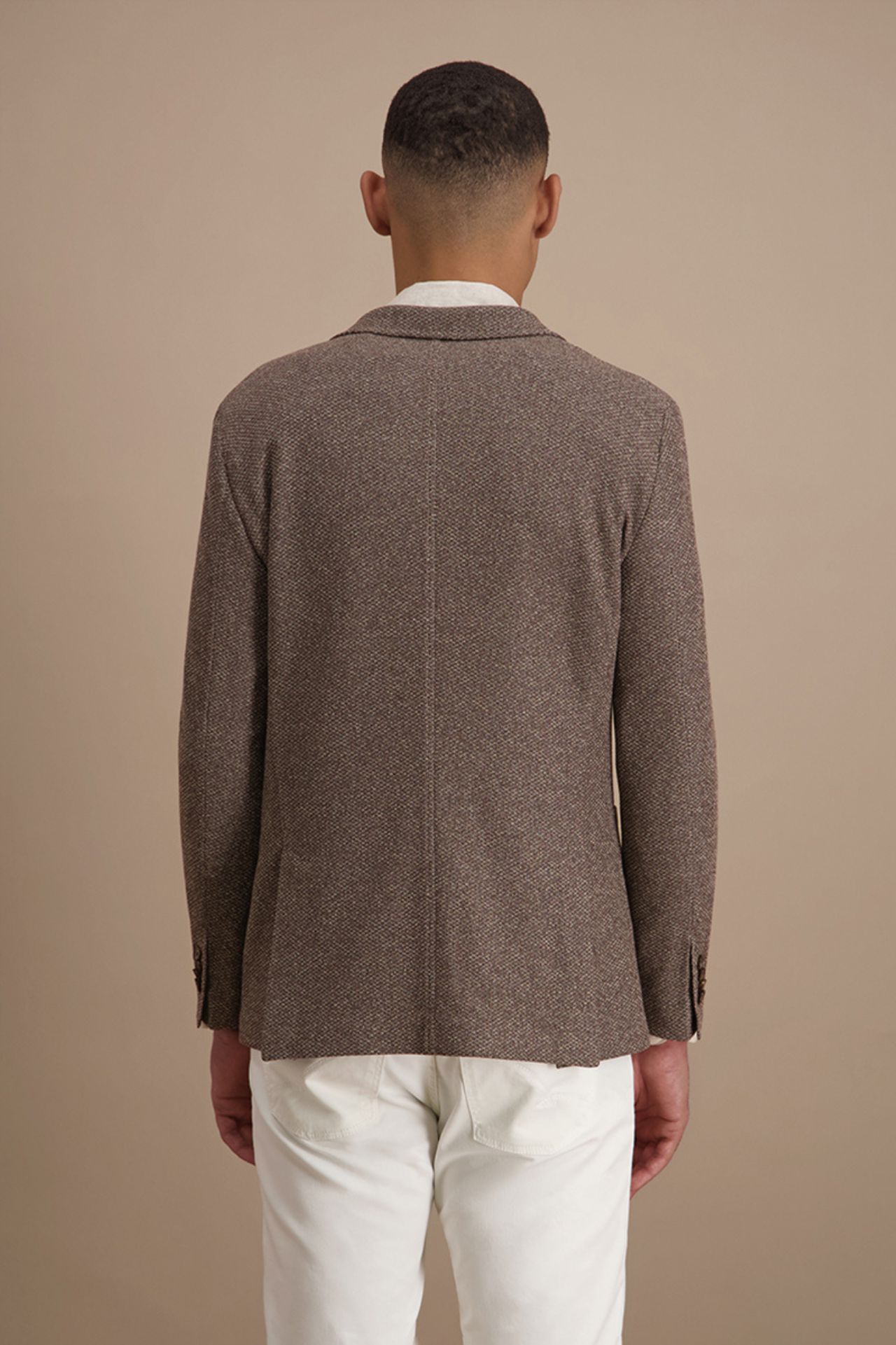 Brązowa marynarka z drobną, teksturowaną fakturą, wykonana z mieszanki bawełny. Klasyczny krój marynarki sprawdzi się zarówno w stylizacjach smart casual, jak i bardziej formalnych. Model ma naszywane kieszenie oraz starannie wykończone detale, które podkreślają jego uniwersalny charakter.