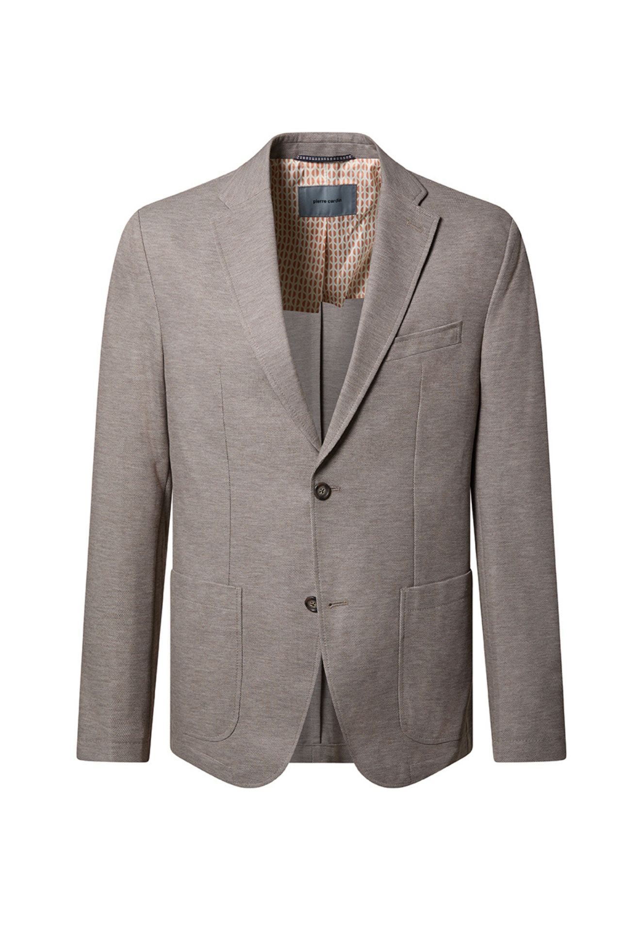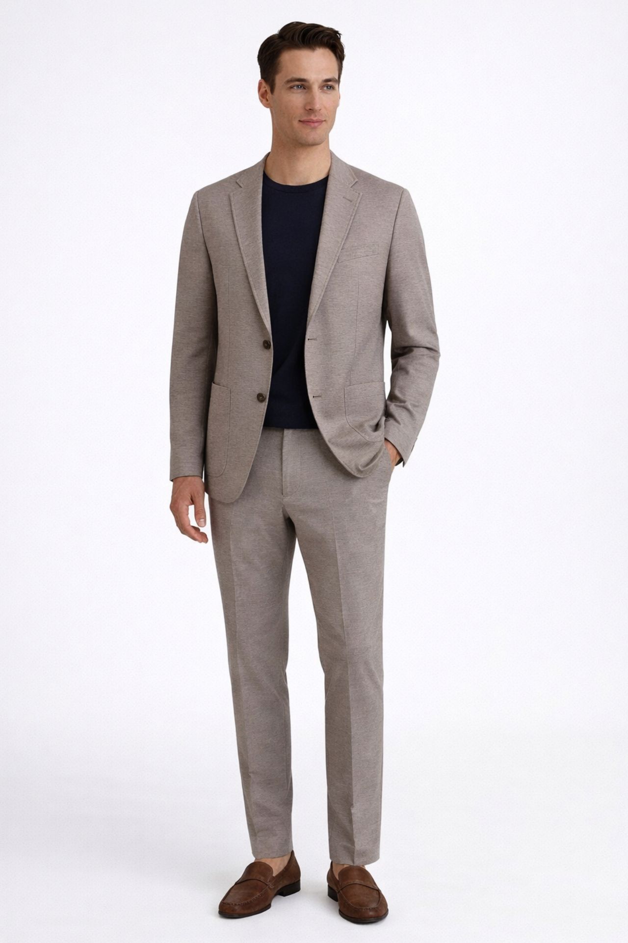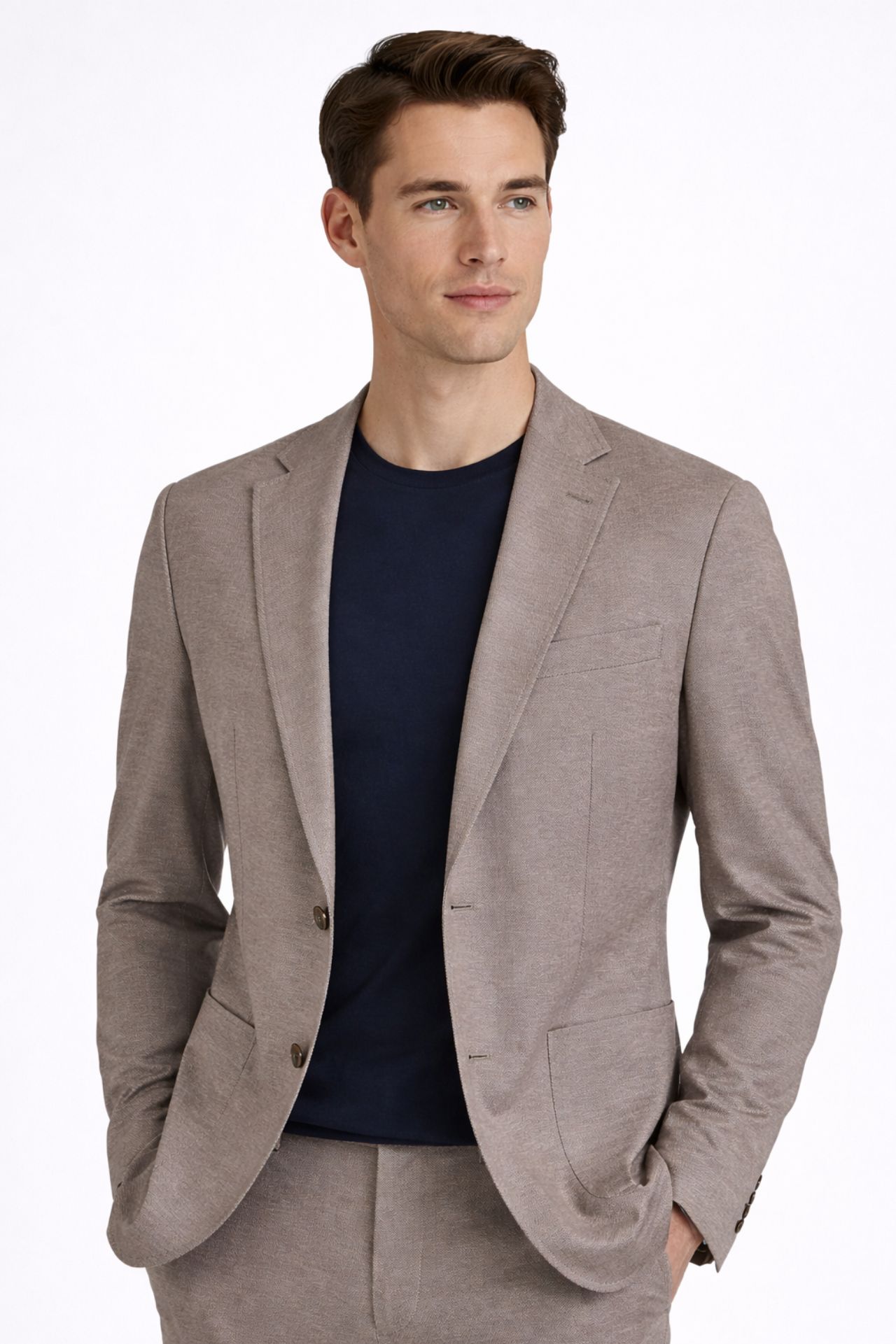 Marynarka męska premium w kolorze cappuccino, wykonana z wysokiej jakości jerseyu, łączy elegancję z wyjątkowym komfortem noszenia. Lekka i elastyczna tkanina zapewnia swobodę ruchów, a dopracowany krój podkreśla nowoczesny, casualowy charakter. Idealna marynarka do stylizacji smart casual, doskonała zarówno na co dzień, jak i na mniej formalne okazje. Model tworzy komplet garniturowy ze spodniami o kodzie produktu 024656.