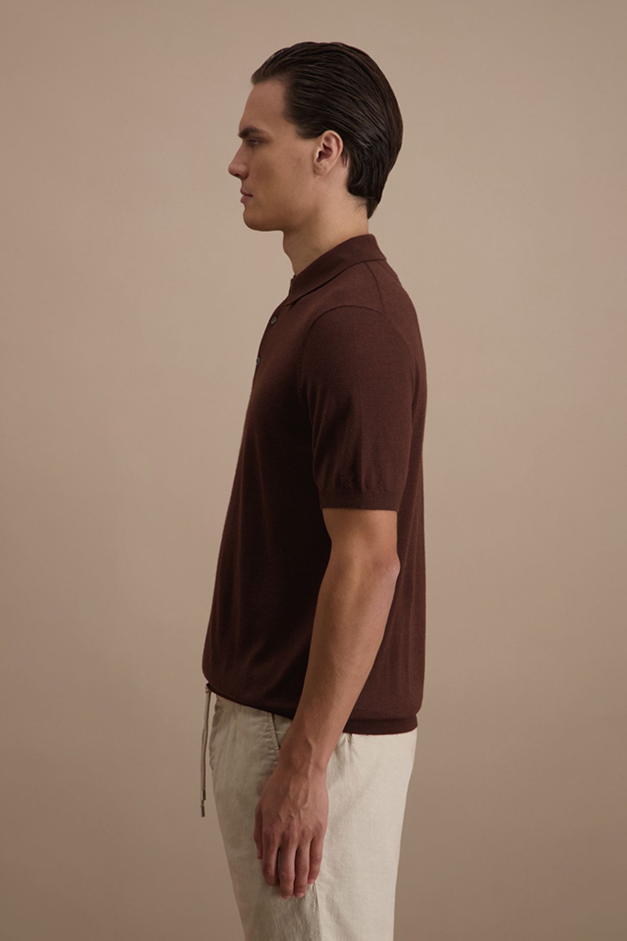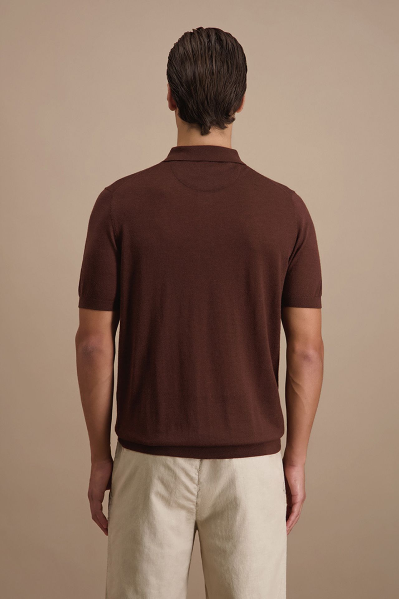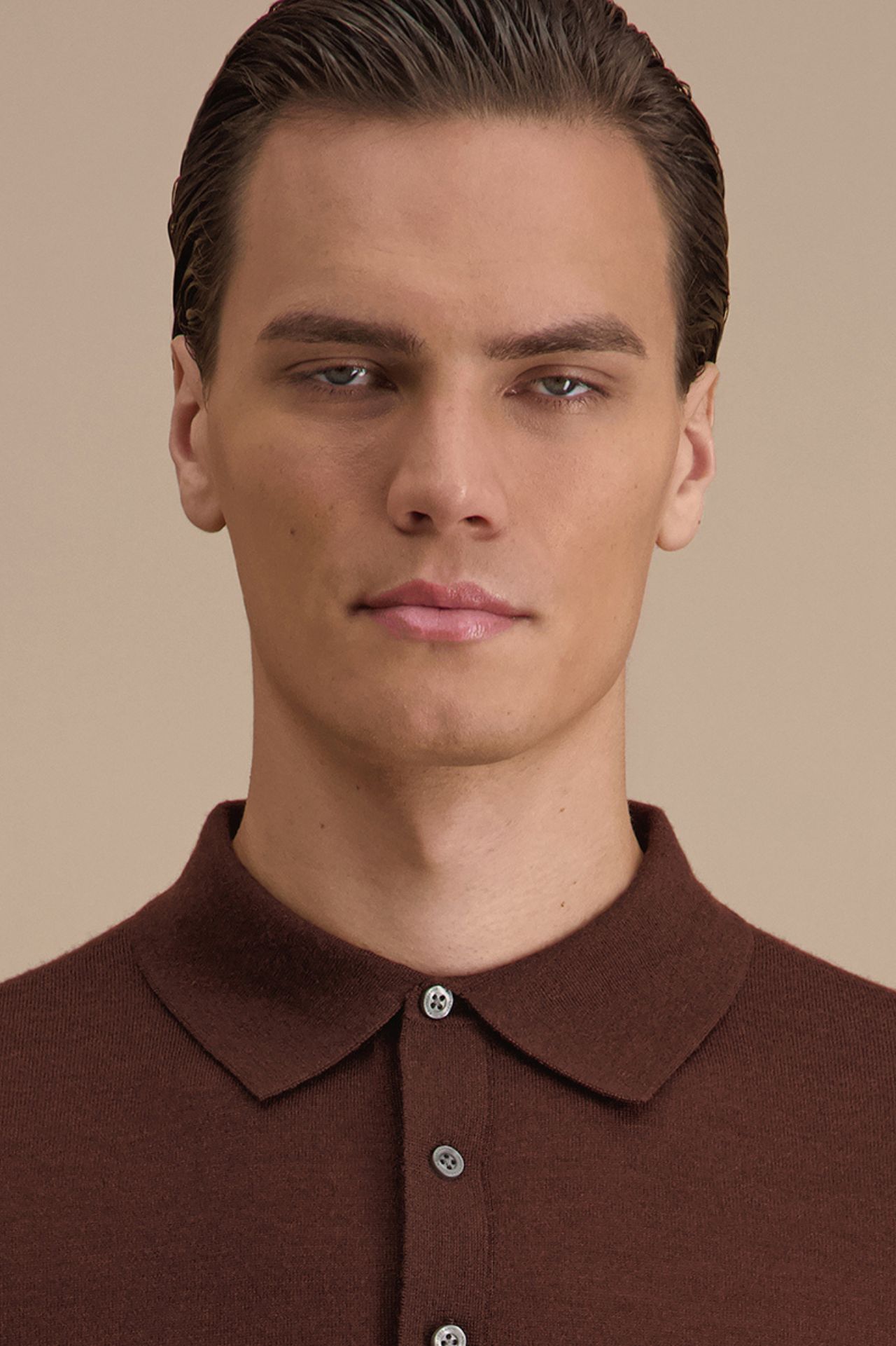 Luksusowa męska koszulka polo z dzianiny z żywej wełny z dodatkiem jedwabiu to synonim elegancji i najwyższej jakości wykonania. Szlachetna przędza zapewnia naturalną termoregulację, wyjątkową miękkość oraz subtelny, matowy połysk, podkreślając ekskluzywny charakter modelu. Brązowe polo premium doskonale sprawdzi się w stylizacjach smart casual i business casual, łącząc ponadczasowy design z komfortem noszenia.