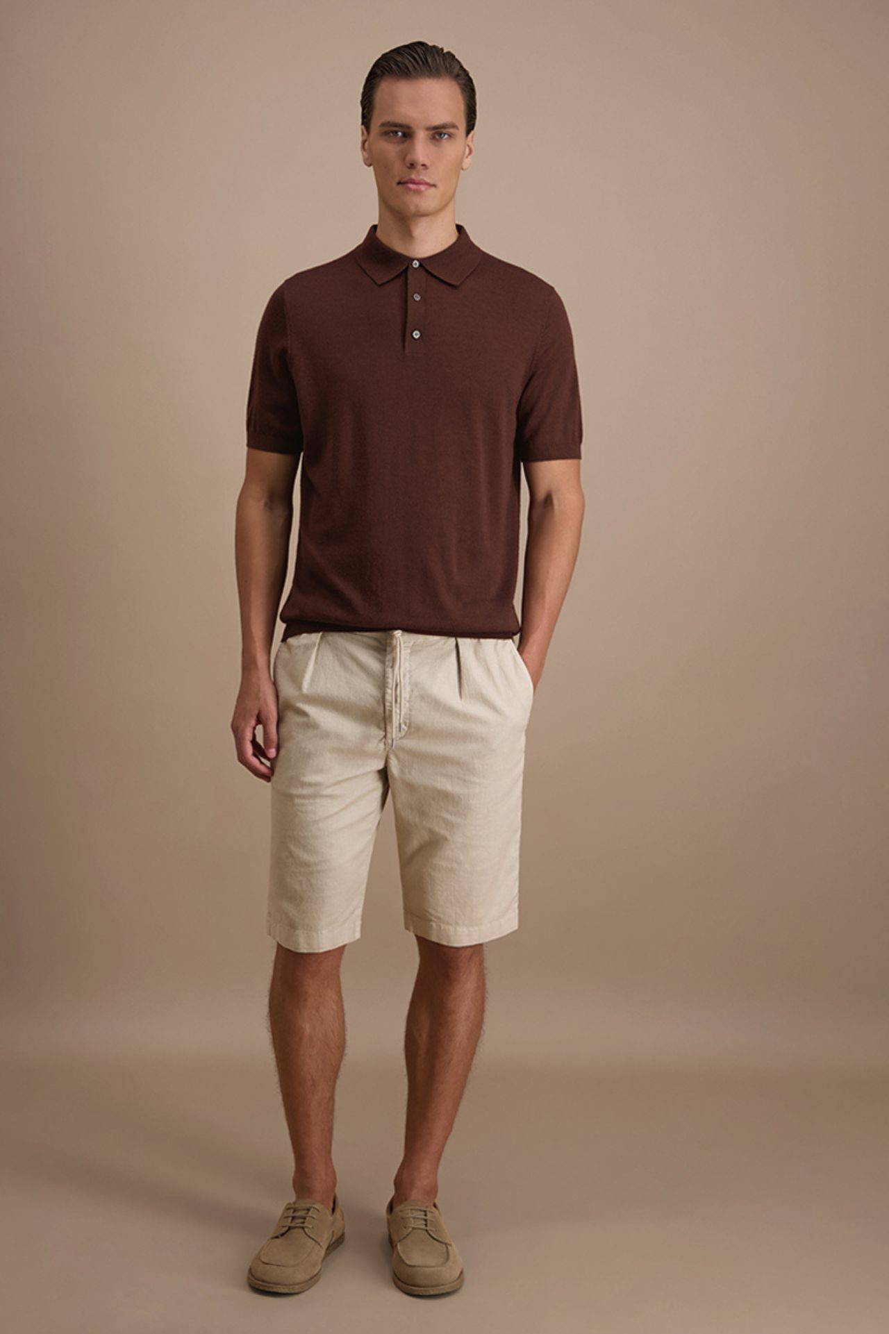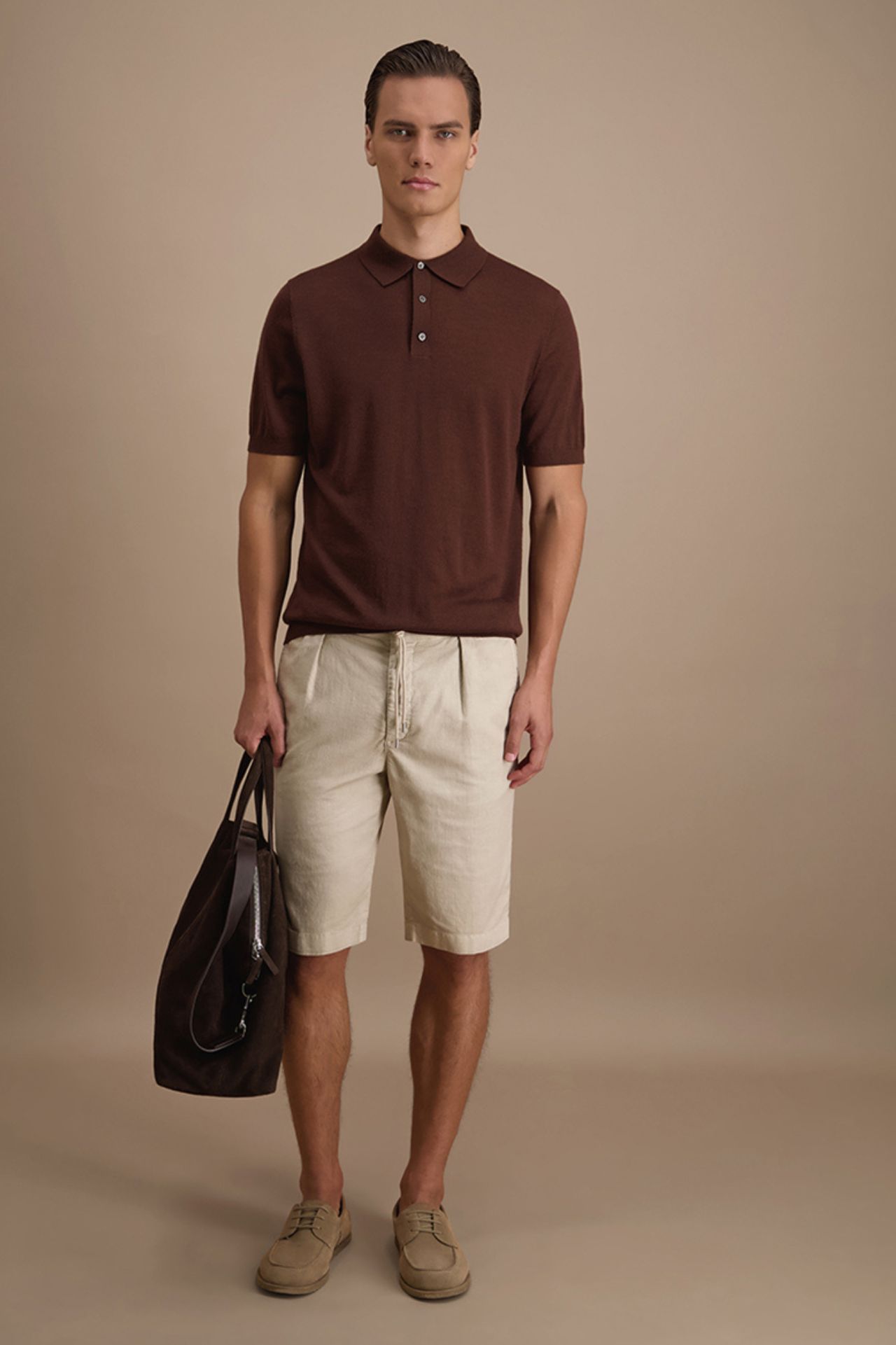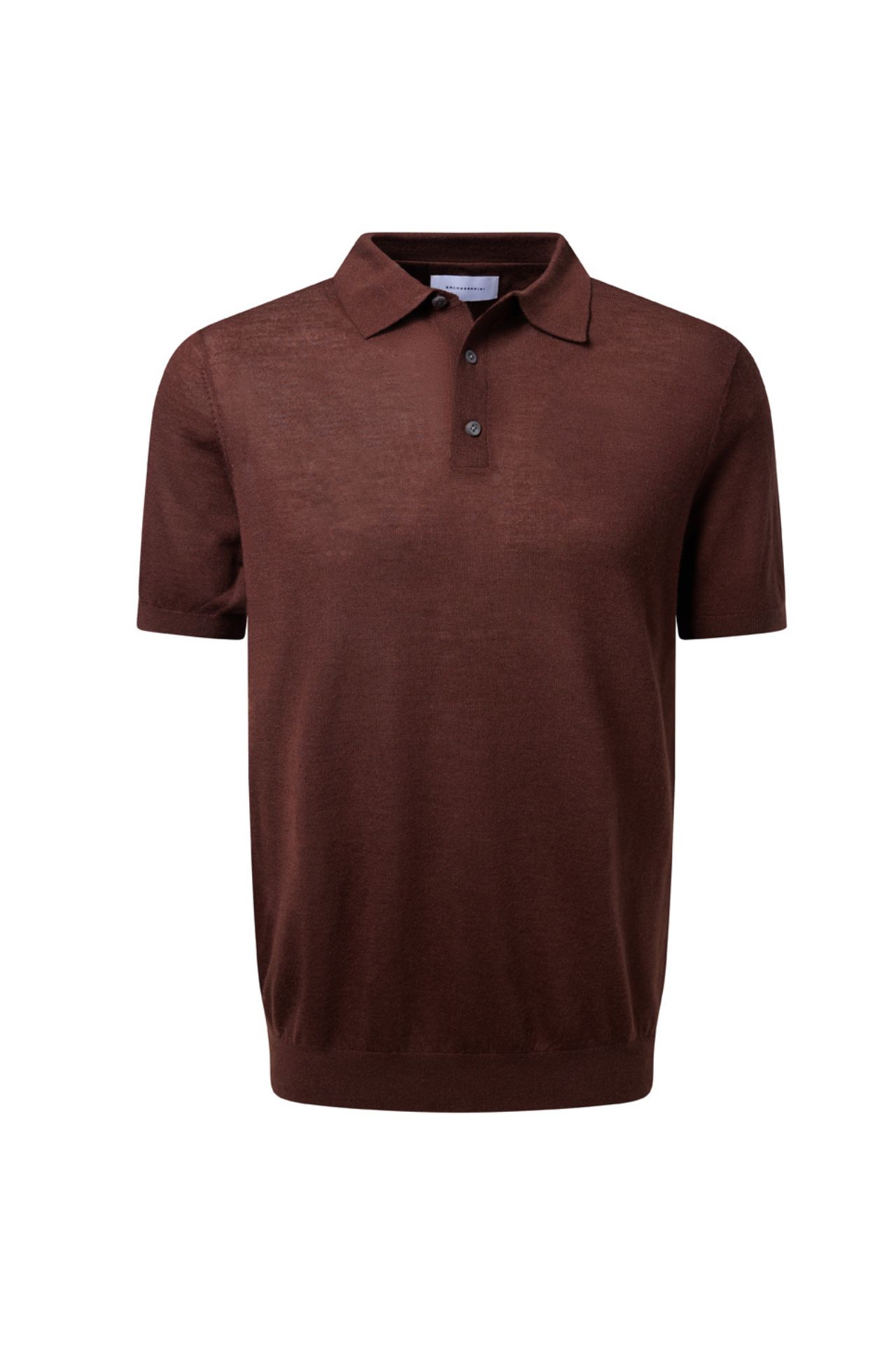 Luksusowa męska koszulka polo z dzianiny z żywej wełny z dodatkiem jedwabiu to synonim elegancji i najwyższej jakości wykonania. Szlachetna przędza zapewnia naturalną termoregulację, wyjątkową miękkość oraz subtelny, matowy połysk, podkreślając ekskluzywny charakter modelu. Brązowe polo premium doskonale sprawdzi się w stylizacjach smart casual i business casual, łącząc ponadczasowy design z komfortem noszenia.