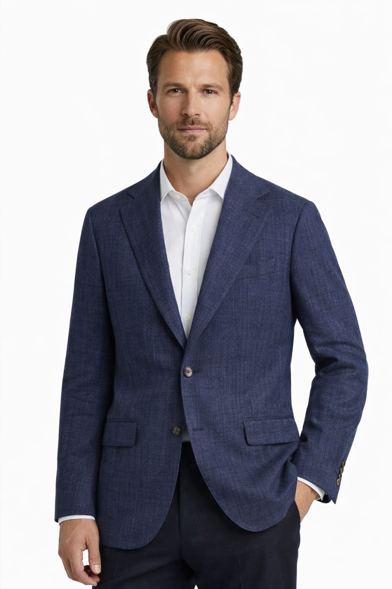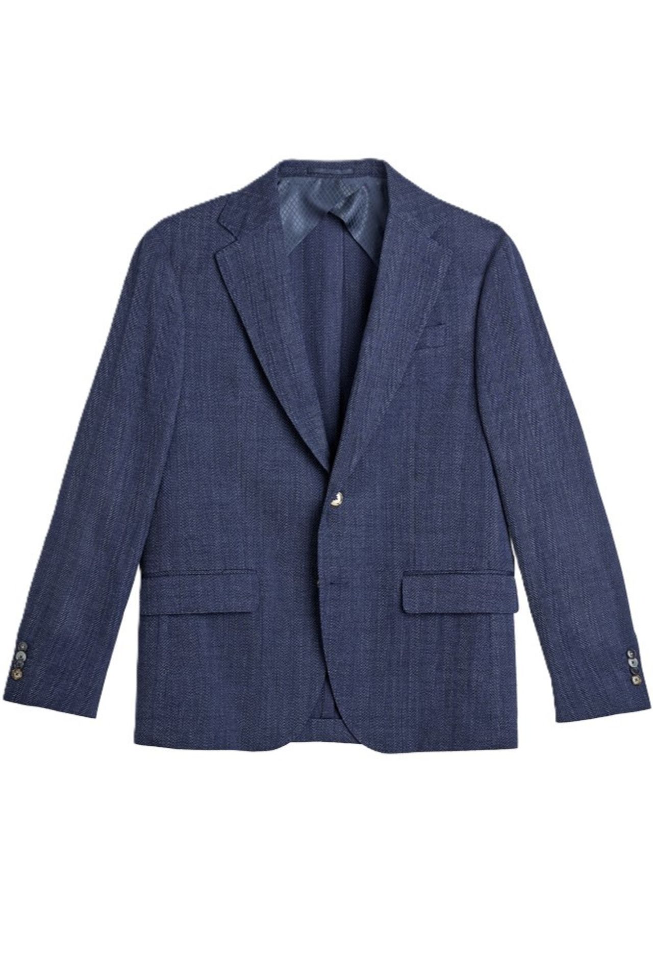 Elegancka marynarka męska wykonana z luksusowej mieszanki żywej wełny, wiskozy, bawełny i elastanu, która zapewnia idealne połączenie komfortu, przewiewności i elastyczności. Strukturalna tkanina o subtelnym wzorze w jodełkę podkreśla jej nowoczesny charakter premium, a dopracowany krój gwarantuje doskonałe dopasowanie do sylwetki. Naturalne włókna odpowiadają za oddychalność i miękkość, czyniąc model idealnym wyborem zarówno na formalne, jak i smart casualowe stylizacje. To ponadczasowa marynarka premium dla mężczyzn ceniących jakość, styl i funkcjonalność.