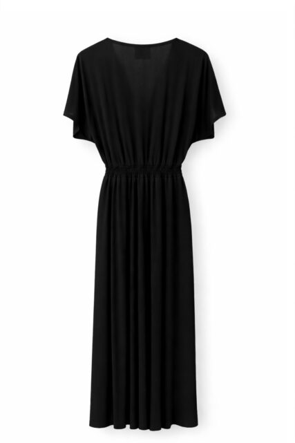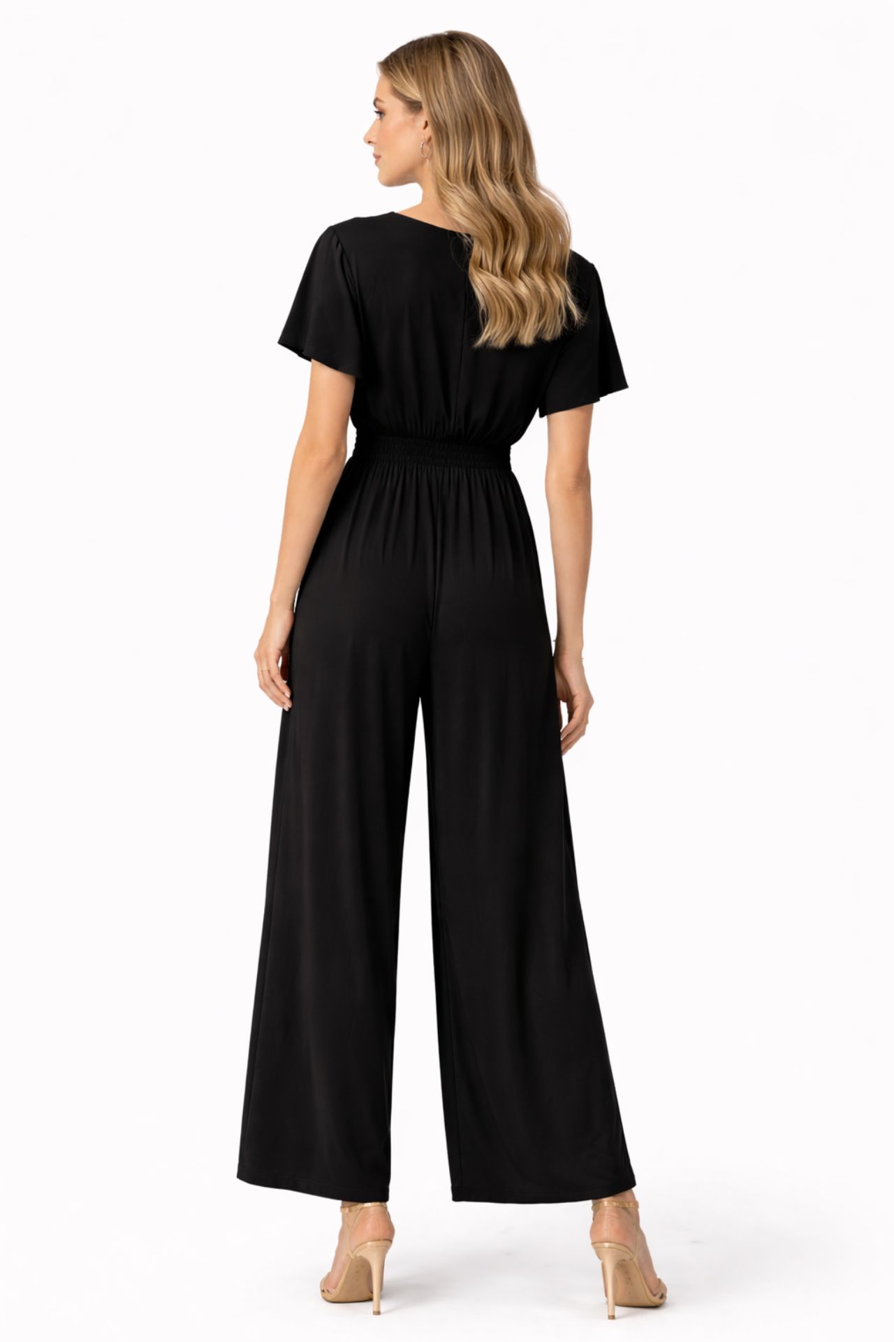 Elegancki kombinezon damski w klasycznej czerni to doskonałe połączenie stylu i komfortu. Wykonany z elastycznej, gładkiej tkaniny, idealnie dopasowuje się do sylwetki, podkreślając jej proporcje. Model z kopertowym dekoltem, zaznaczoną talią i szerokimi nogawkami tworzy nowoczesną, wyrafinowaną stylizację na wyjątkowe okazje.