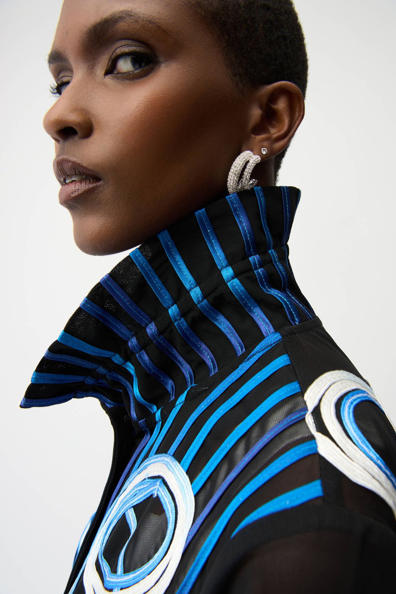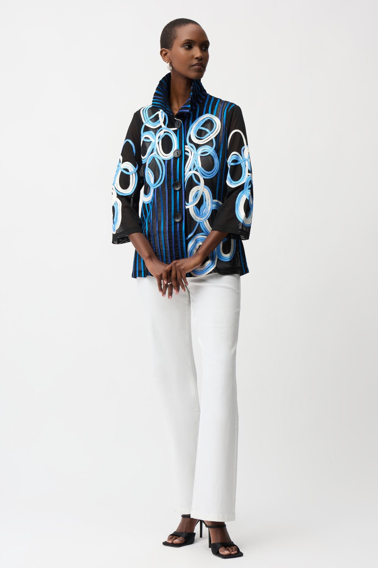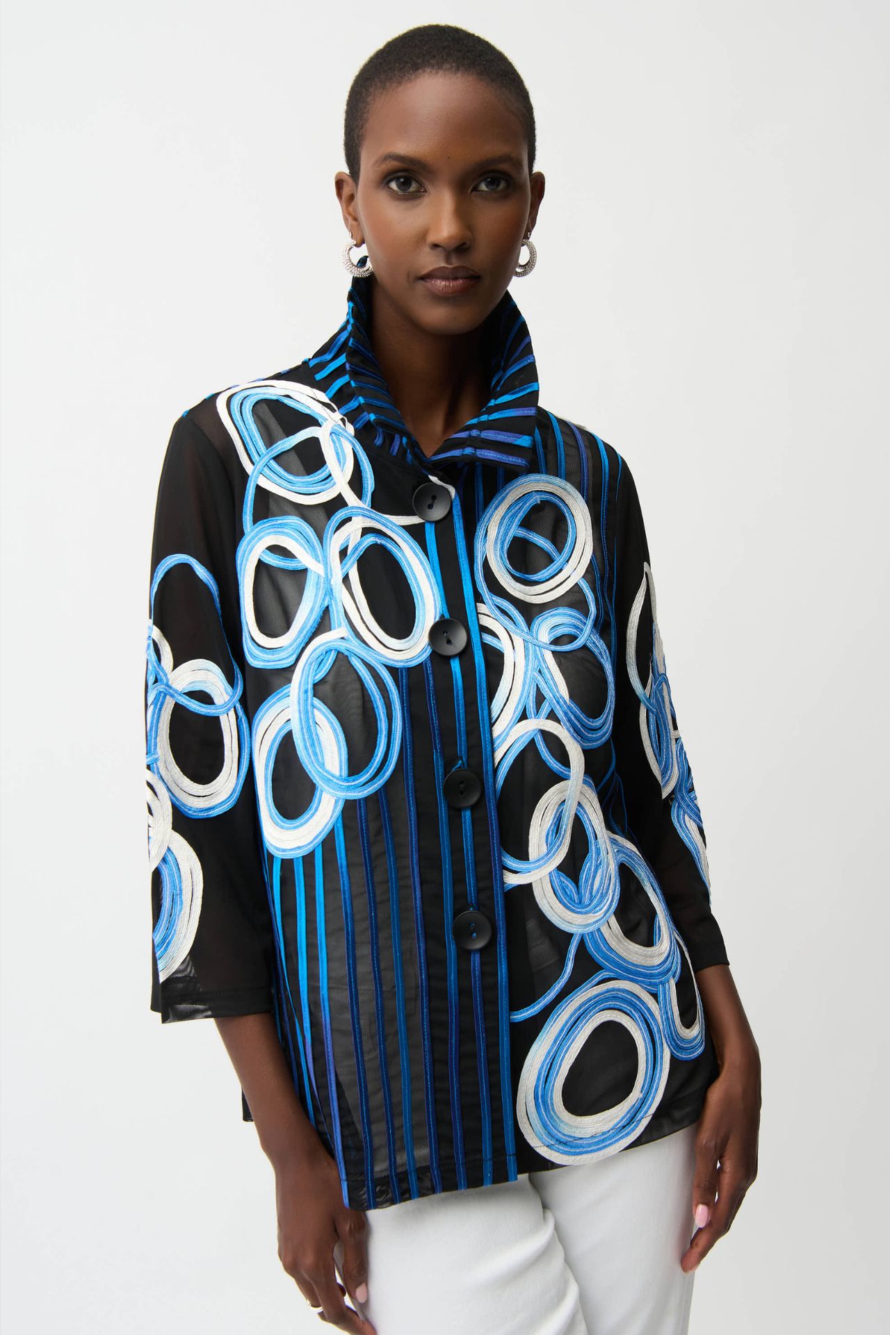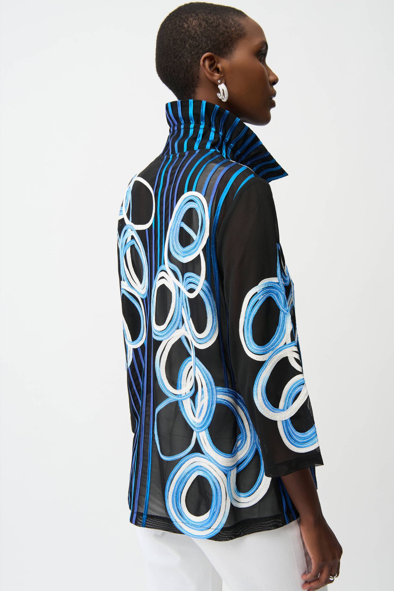 Koszula premium Joseph Ribkoff o regularnym kroju i długości do bioder zachwyca nowoczesnym, artystycznym designem, łącząc abstrakcyjny wzór z subtelnymi haftami i pionowymi liniami. Model z kołnierzykiem oraz rękawem 3/4 zapewnia komfort noszenia i elegancki wygląd na co dzień oraz na półformalne okazje. Wyjątkowe detale i dopracowane wykończenie sprawiają, że to stylowa koszula damska idealna do nowoczesnej garderoby.