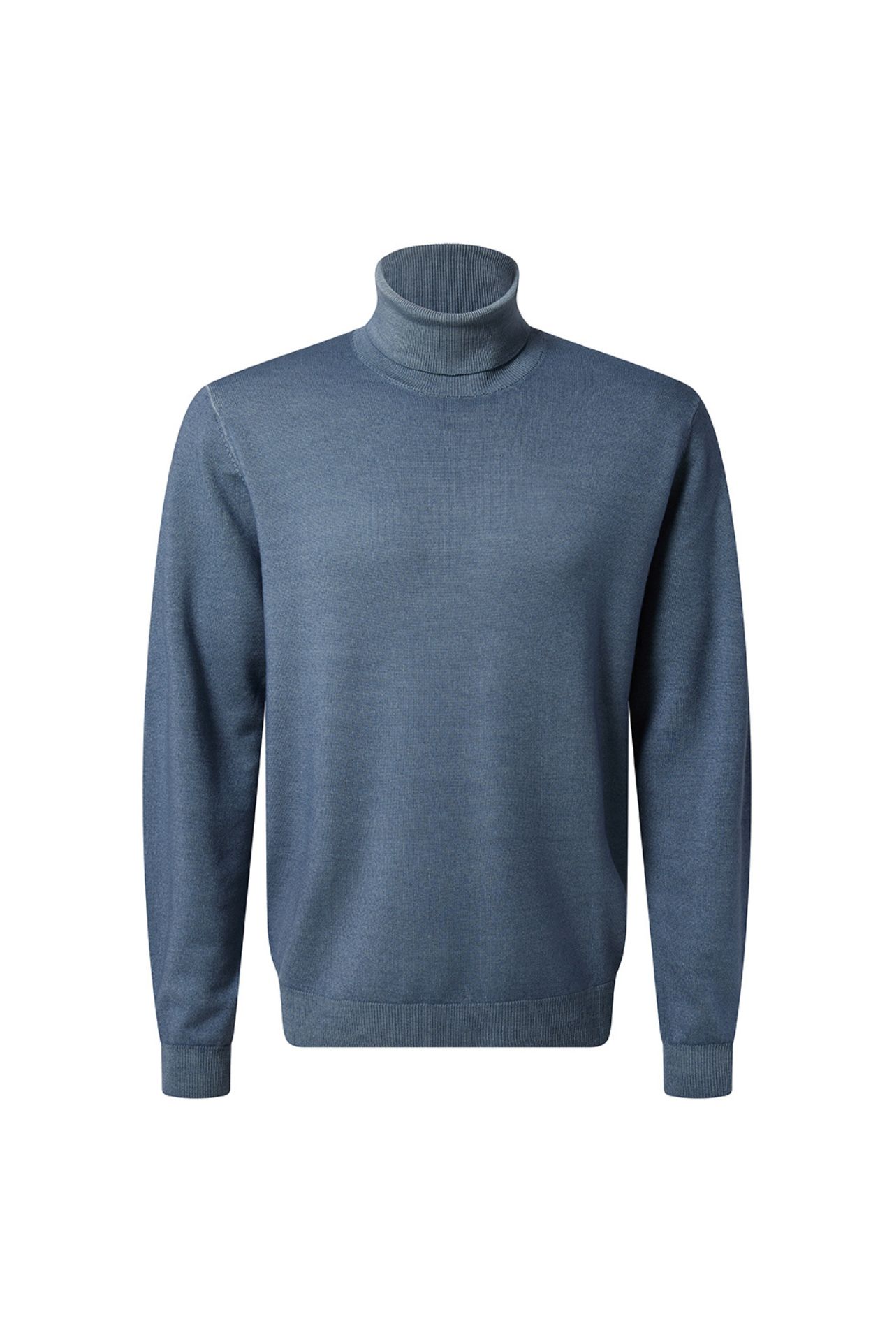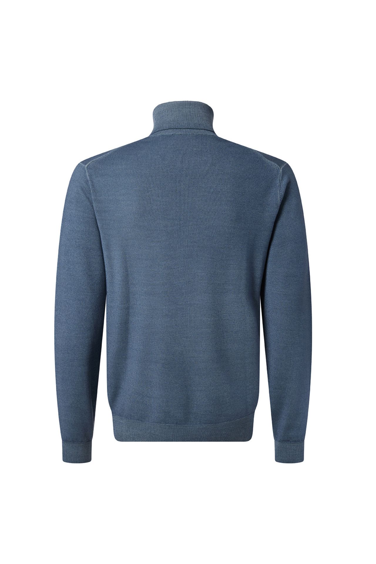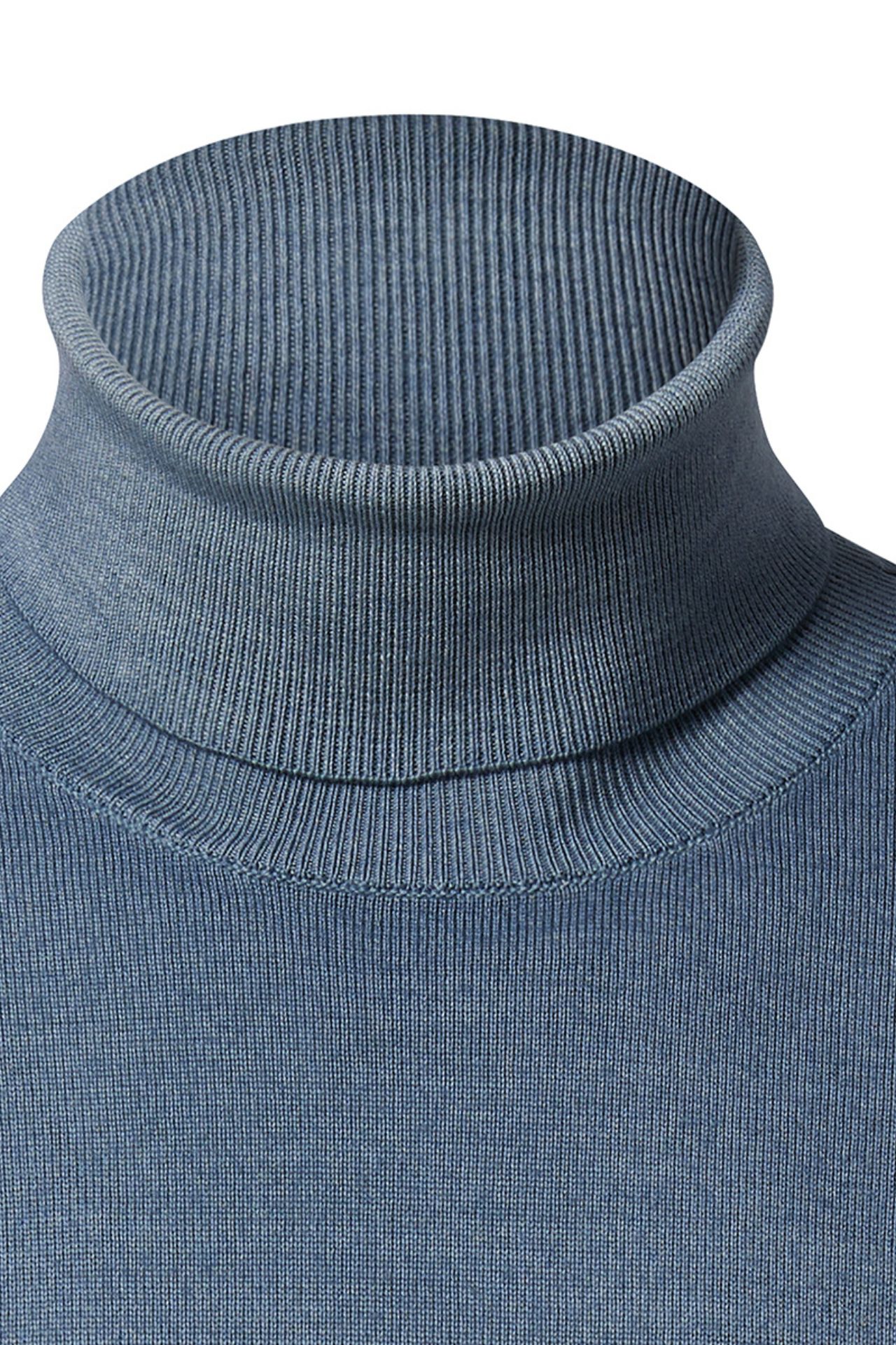 Męski sweter z golfem w kolorze niebieskim, o denimowym odcieniu. Wykonany w 100% z wełny merino, wyróżnia się miękkością i trwałością naturalnej przędzy. Subtelnie dopasowany krój i wykończenie wysokim golfem przy szyi nadają mu nowoczesny charakter, a jednocześnie zapewniają wygodę i ochronę w chłodniejsze dni. Doskonały wybór do zestawów smart casual i codziennych stylizacji.