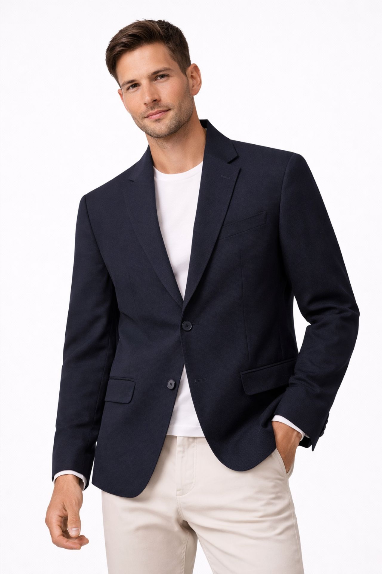 Granatowa marynarka męska o klasycznym kroju to ponadczasowa propozycja w segmencie odzieży premium, idealna do eleganckich i smart casualowych stylizacji. Model zapinany na dwa guziki, z klapami otwartymi i starannie wykończonym wnętrzem, zapewnia komfort noszenia oraz dopasowany wygląd. Uniwersalny charakter sprawia, że marynarka doskonale sprawdzi się w wielu stylizacjach.