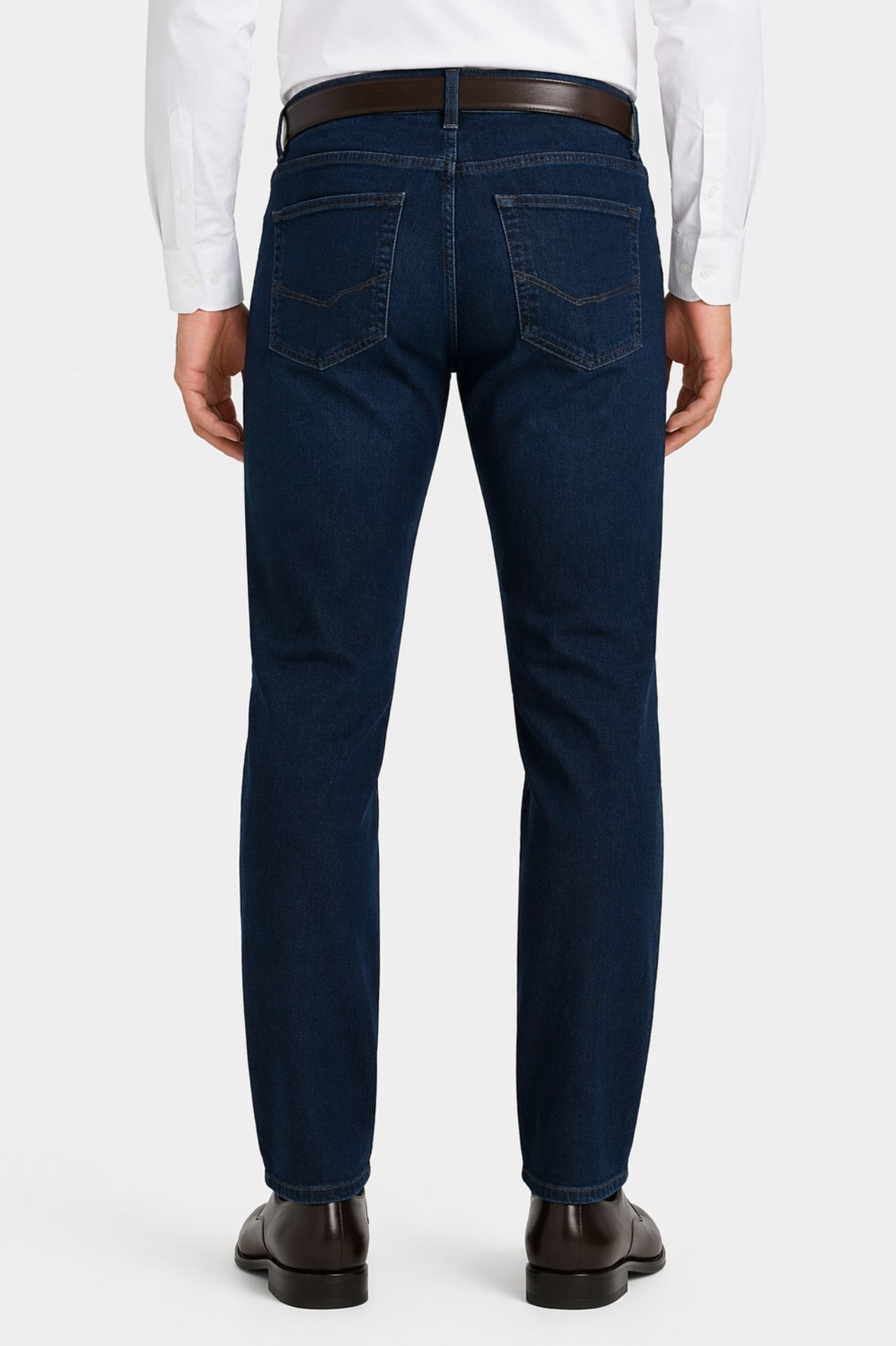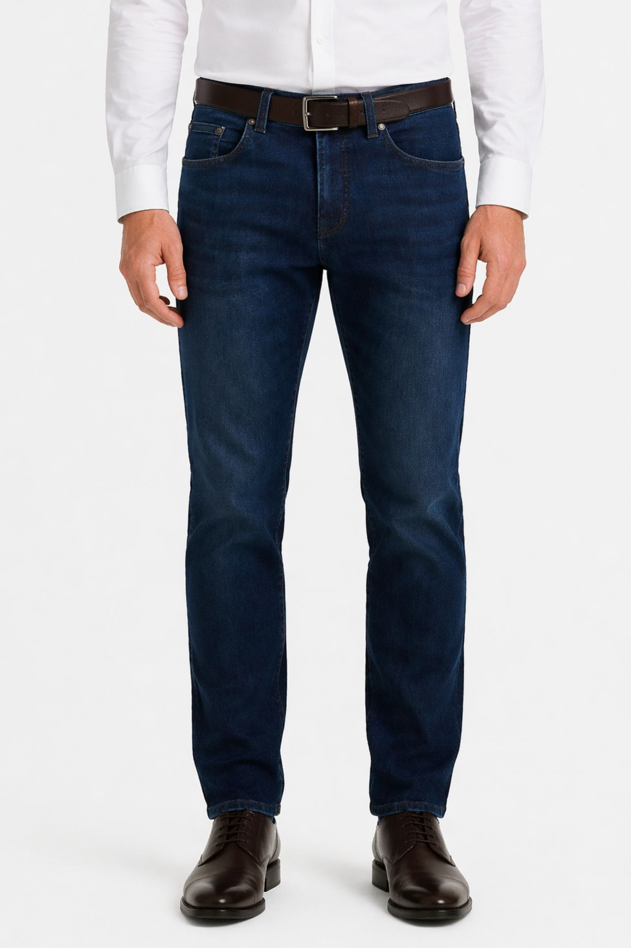 Ciemnoniebieskie jeansy z subtelnymi przetarciami na nogawkach, uszyte z lekkiego, przyjemnego w dotyku i elastycznego materiału. Tkanina jest łatwa w utrzymaniu i dobrze dopasowuje się do sylwetki, zapewniając komfort oraz swobodę ruchów podczas codziennego użytkowania.