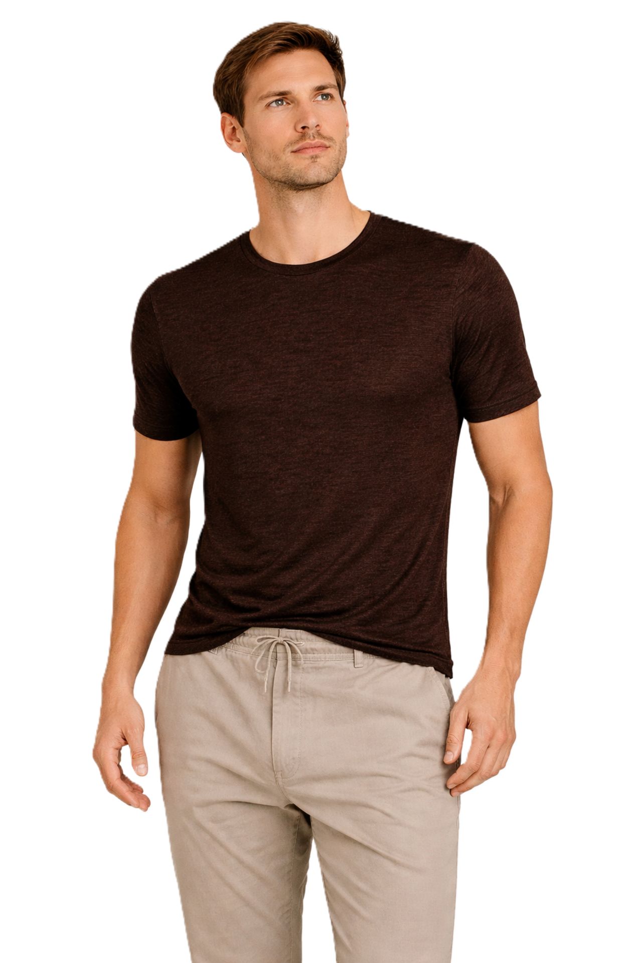 Ciemnobrązowy t-shirt premium z mieszanki lnu, bawełny i poliamidu to nowoczesna baza męskiej garderoby, która łączy lekkość, przewiewność i wysoki komfort noszenia. Regularny krój zapewnia swobodne, klasyczne dopasowanie. To uniwersalny t-shirt męski premium, idealny do codziennych stylizacji oraz dopracowanych zestawów smart casual.