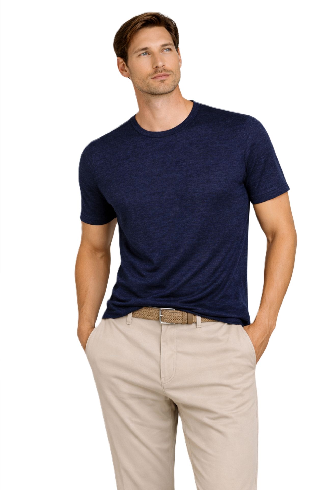 Granatowy t-shirt premium z mieszanki lnu, bawełny i poliamidu to stylowa propozycja dla mężczyzn, którzy cenią komfort, lekkość i nowoczesną elegancję. Regularny krój zapewnia swobodne dopasowanie, a subtelna struktura dzianiny nadaje modelowi wyrafinowany, casualowy charakter. To uniwersalny t-shirt męski, który świetnie sprawdzi się zarówno w codziennych stylizacjach, jak i w zestawach smart casual.