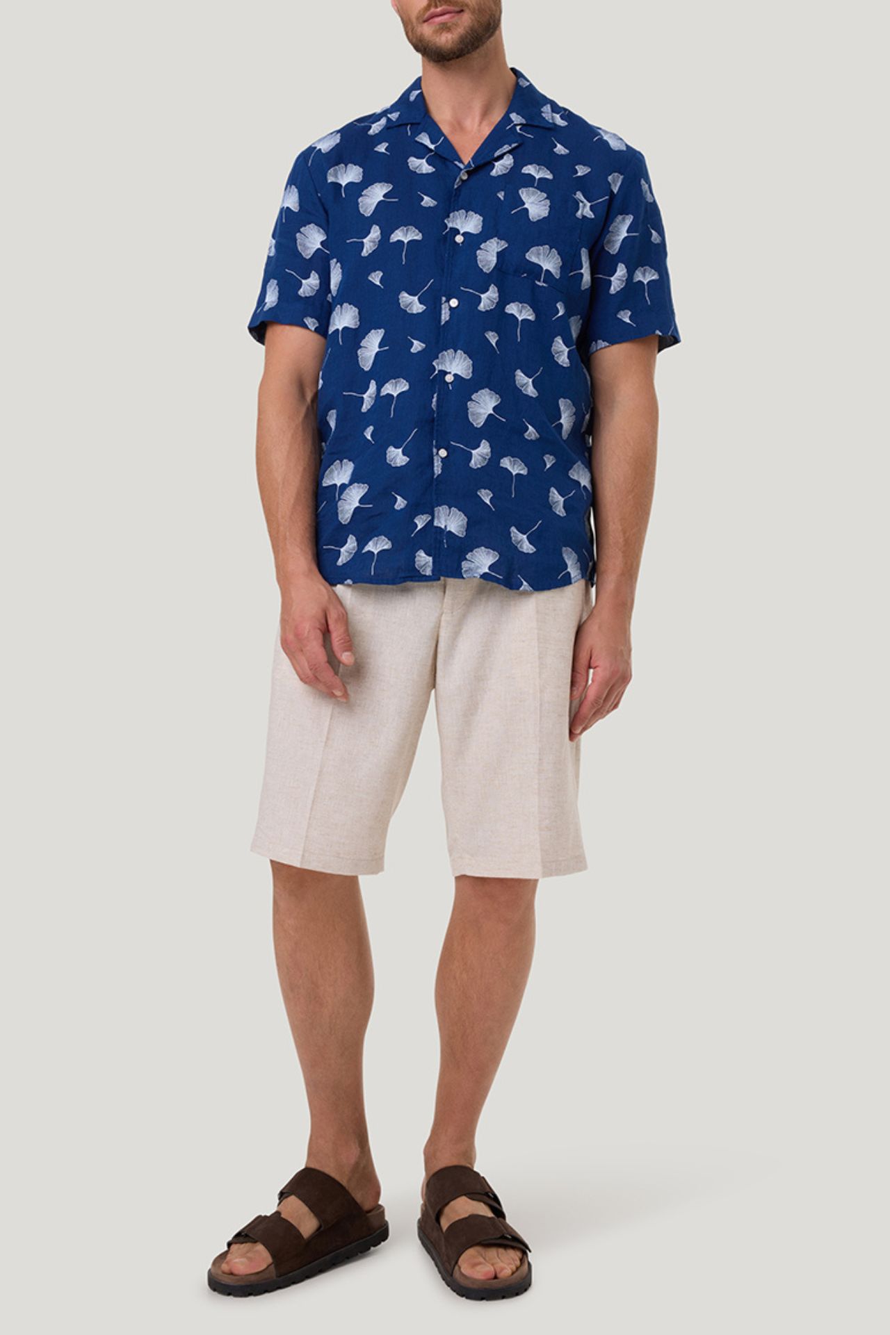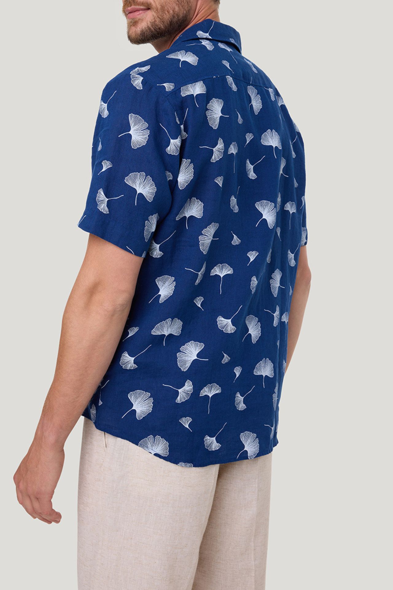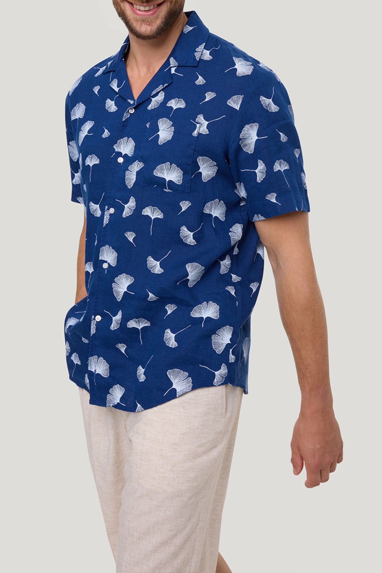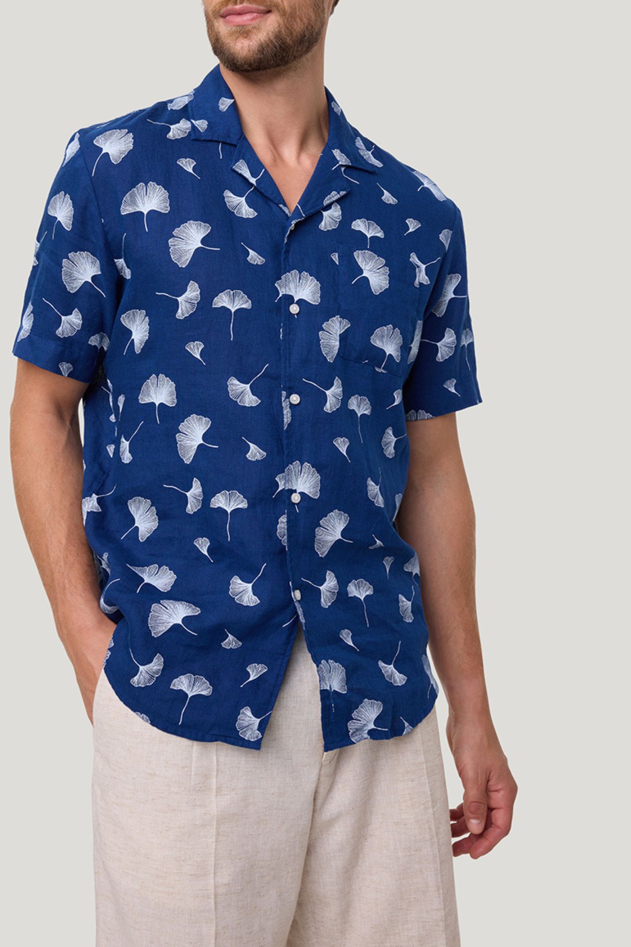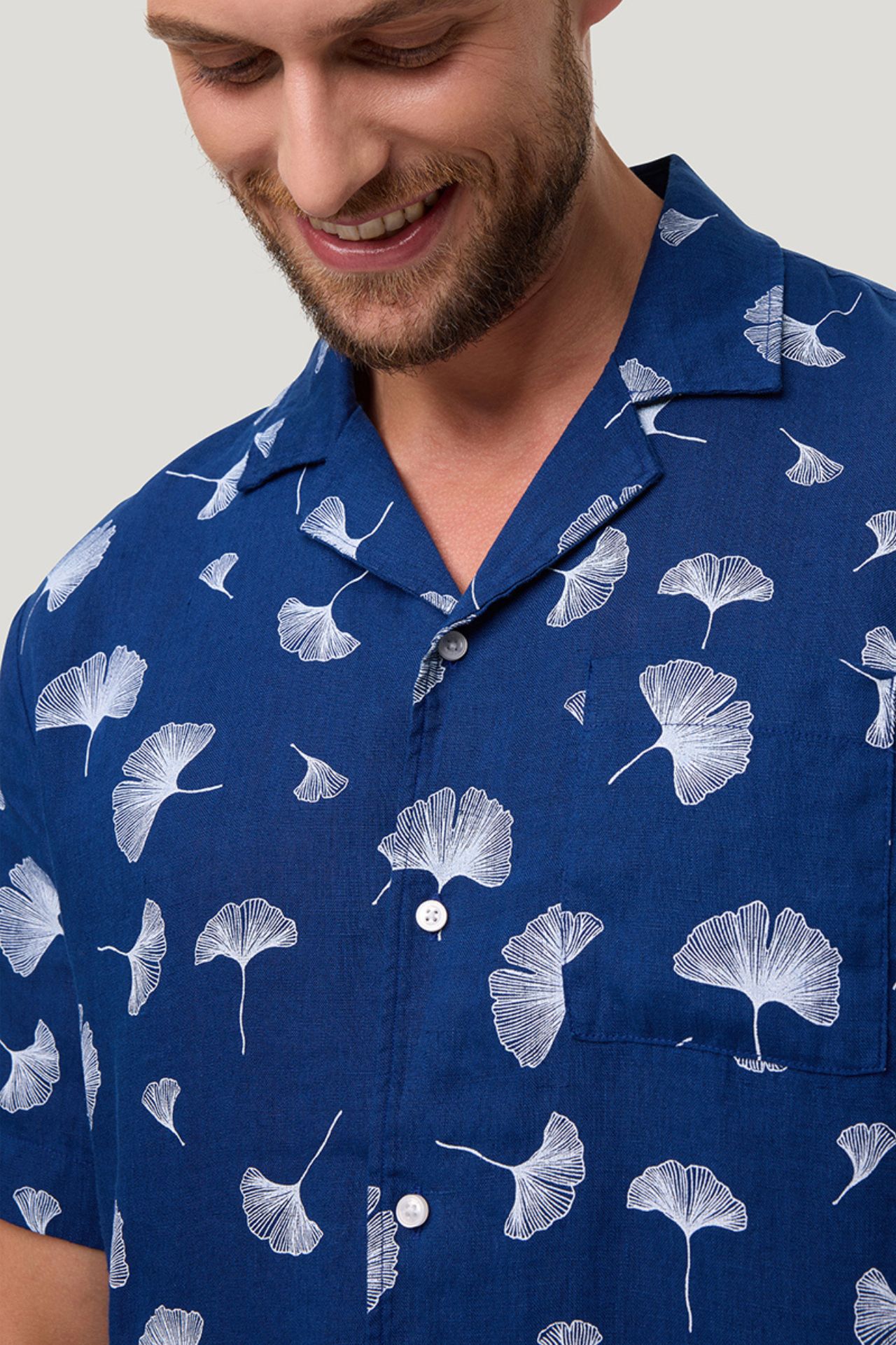 Koszula o regularnym, komfortowym kroju, uszyta z lnianej tkaniny w kolorze niebieskim z nadrukiem z motywem roślinnym.