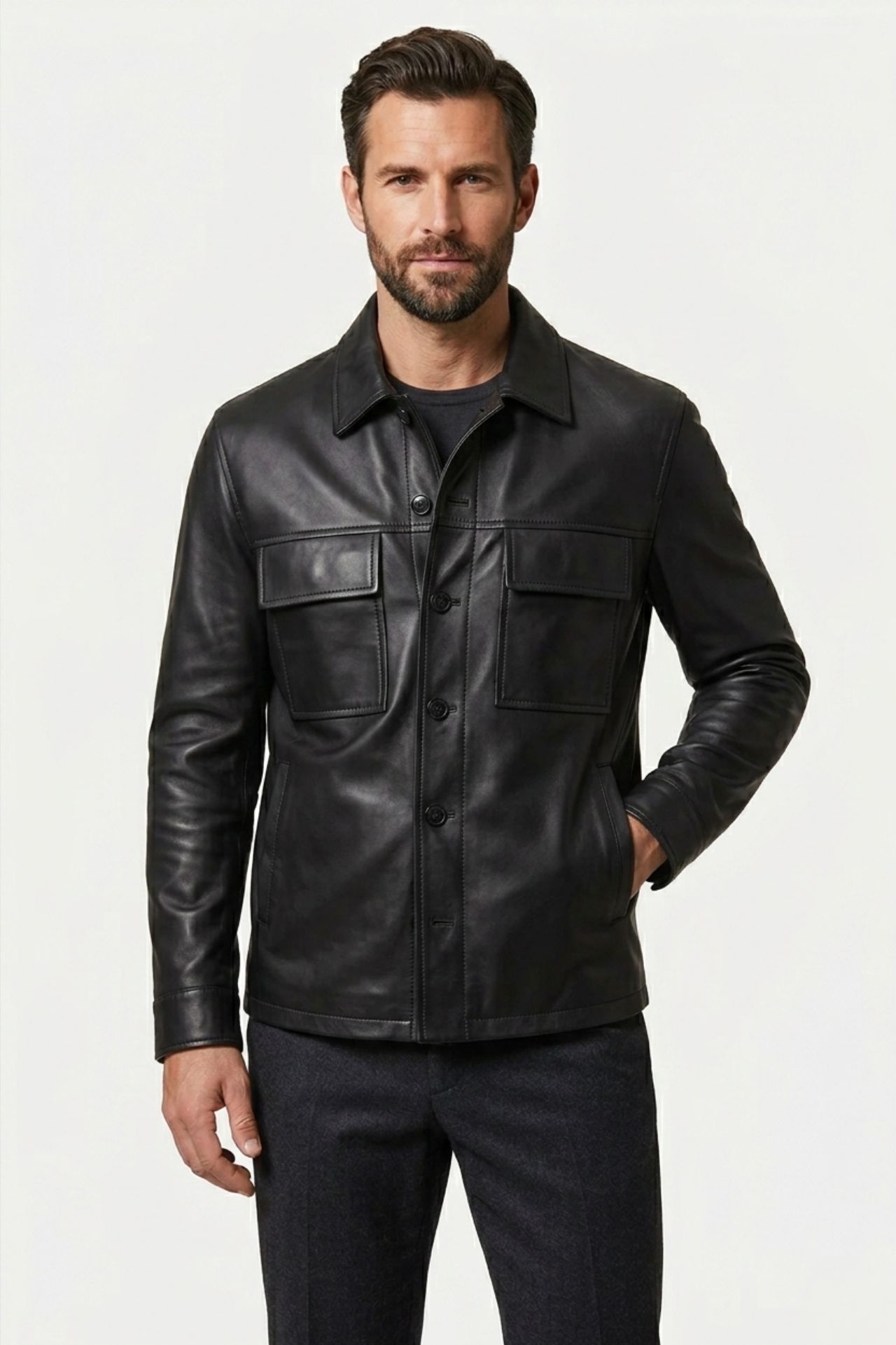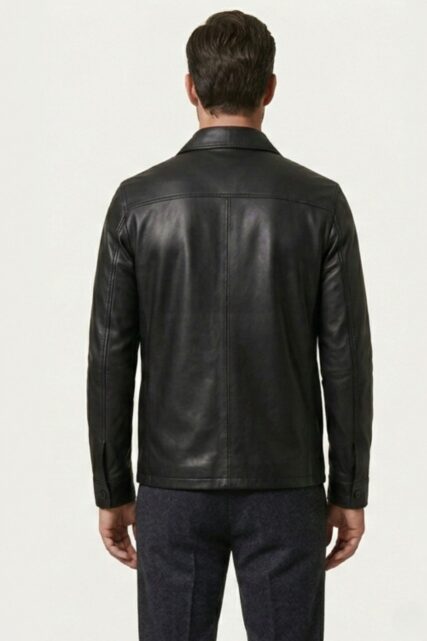 Czarna kurtka wykonana z wysokiej jakości licowej skóry owczej to klasyczny model o prostym kroju, który sprawdzi się zarówno w codziennych jak i bardziej dopracowanych stylizacjach. Naturalna skóra gwarantuje trwałość, elastyczność i komfort noszenia. Kurtka posiada dwie praktyczne kieszenie z klapami na piersi oraz zapięcie na guziki, co podkreśla jej uniwersalny, minimalistyczny charakter. To solidna propozycja na sezon przejściowy, odpowiednia dla mężczyzn ceniących naturalne materiały i prostą, funkcjonalną formę.