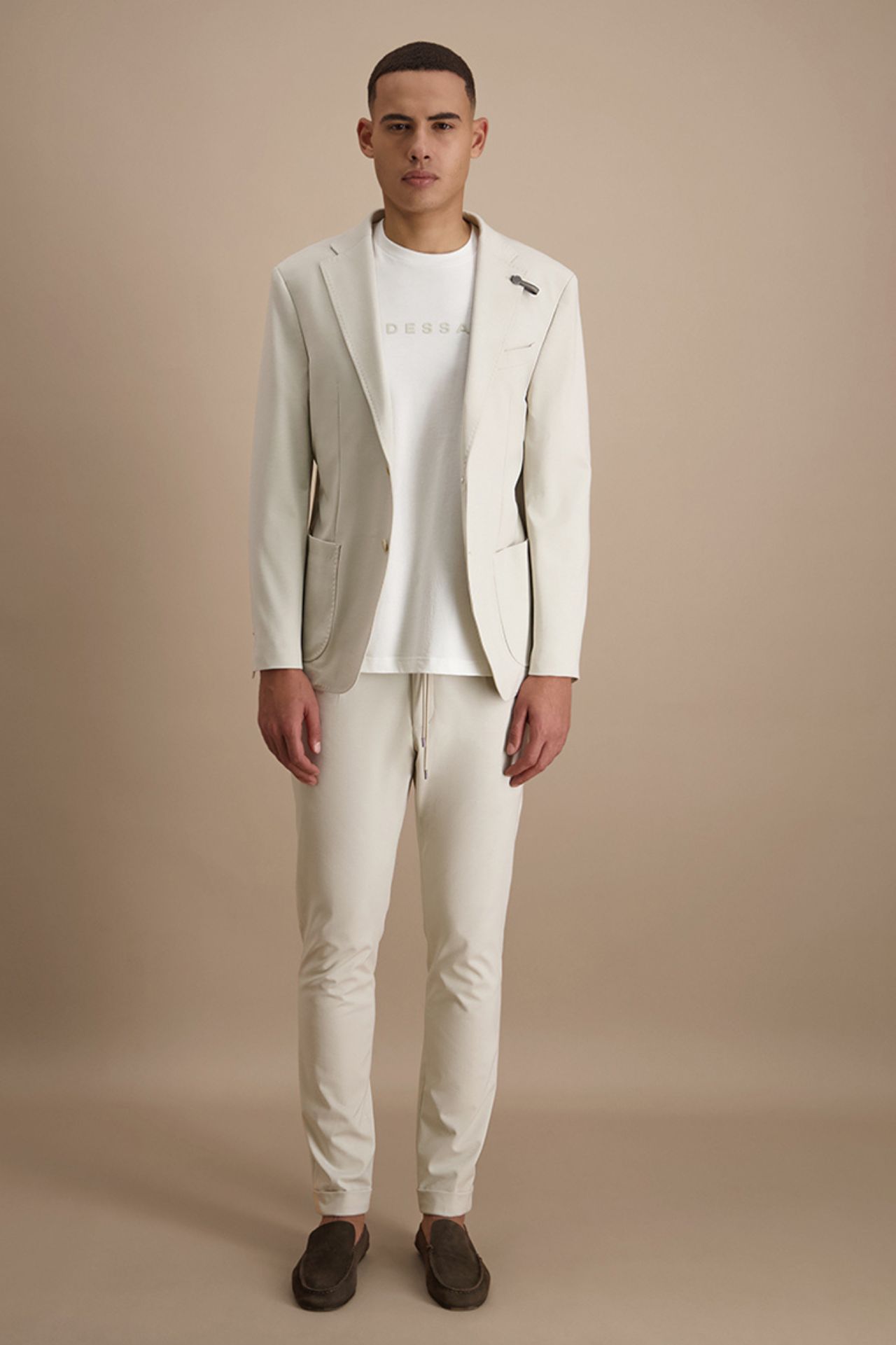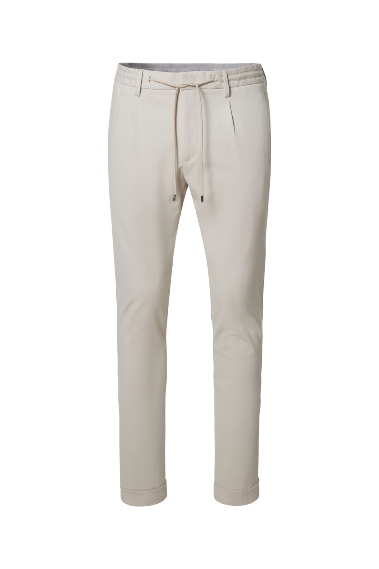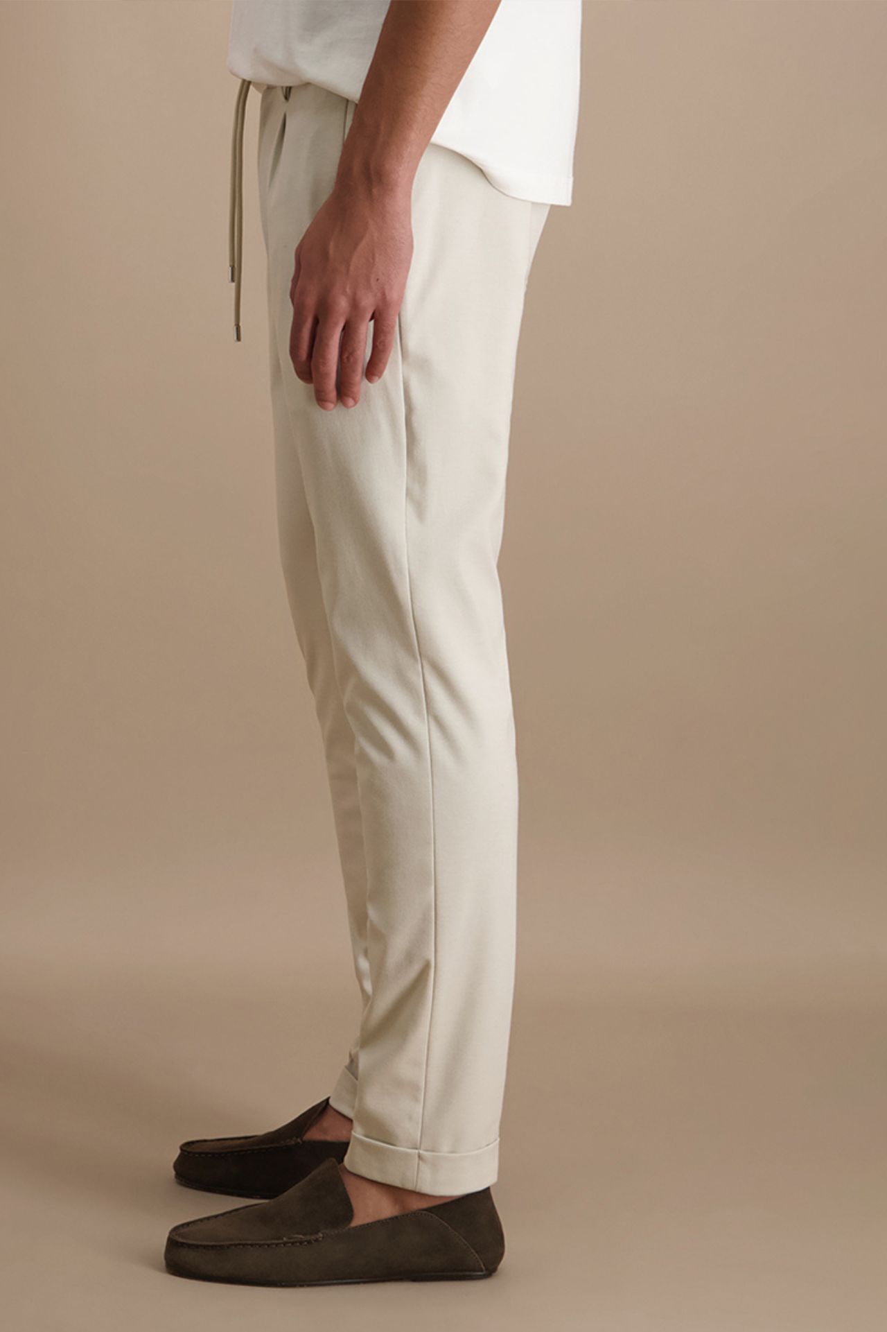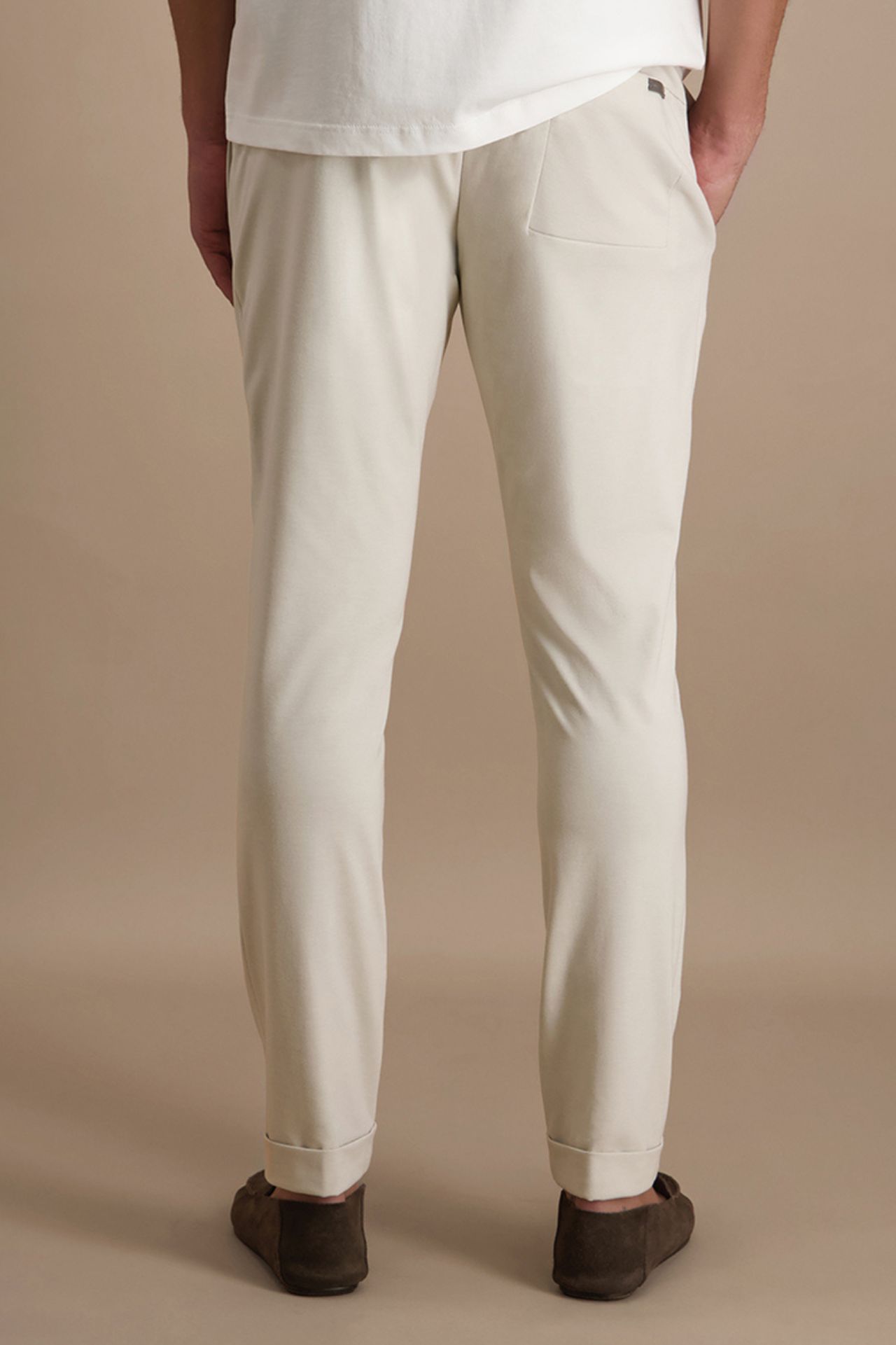 Spodnie w jasnym, eleganckim odcieniu, wykonane z wysokiej jakości mieszanki wiskozy w elastycznej strukturze jerseyu, która zapewnia maksymalny komfort i swobodę ruchów. Model łączy wyrafinowaną linię klasycznych spodni z nowoczesnym charakterem joggerów, oferując regulację w pasie i dopracowany, zwężany krój nogawki. Miękka, sprężysta tkanina doskonale dopasowuje się do sylwetki, zachowując przy tym estetyczny, garniturowy wygląd. Spodnie tworzą komplet z marynarką o kodzie produktu 024558, stanowiąc współczesną interpretację elegancji w wydaniu premium.