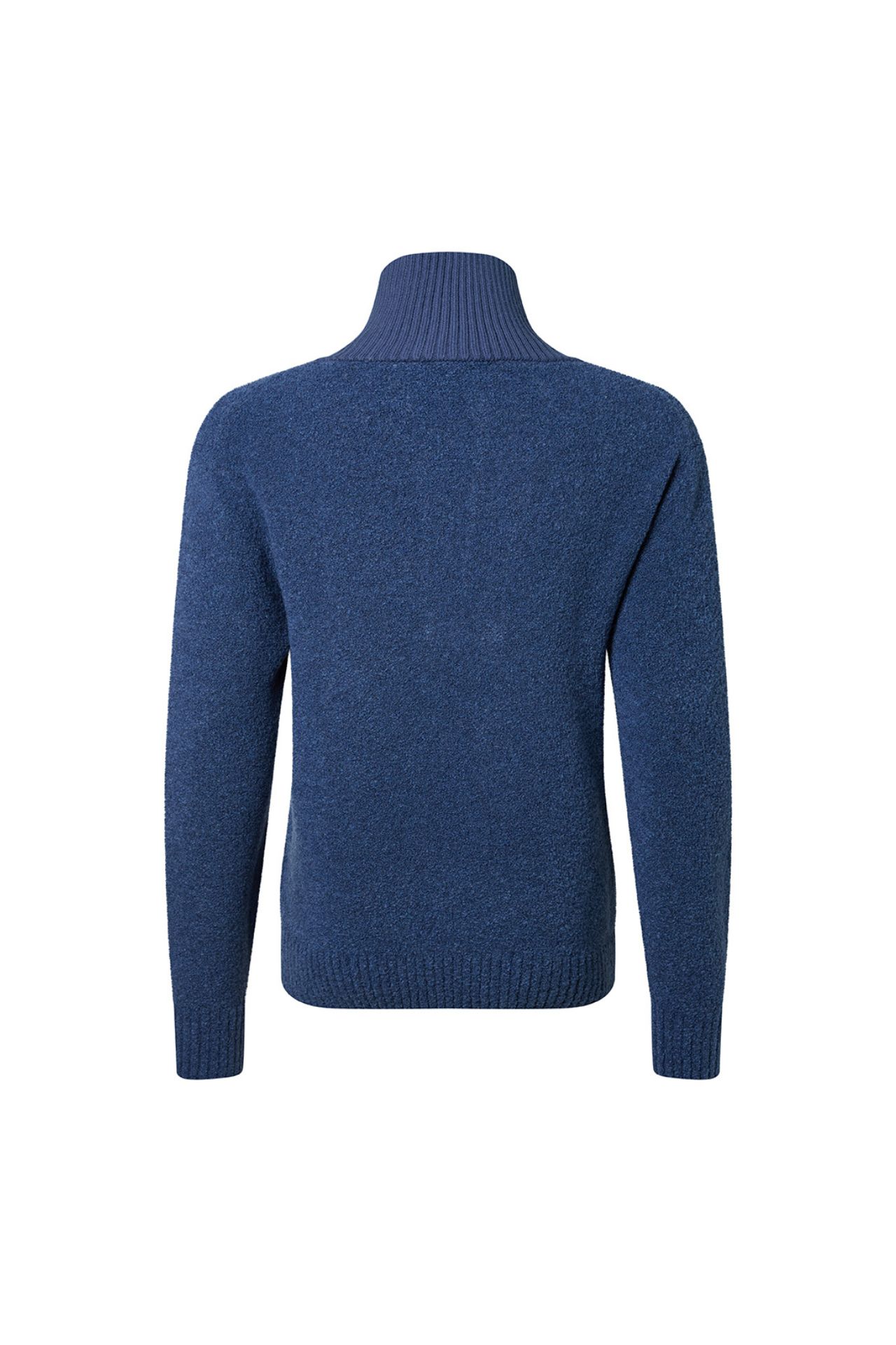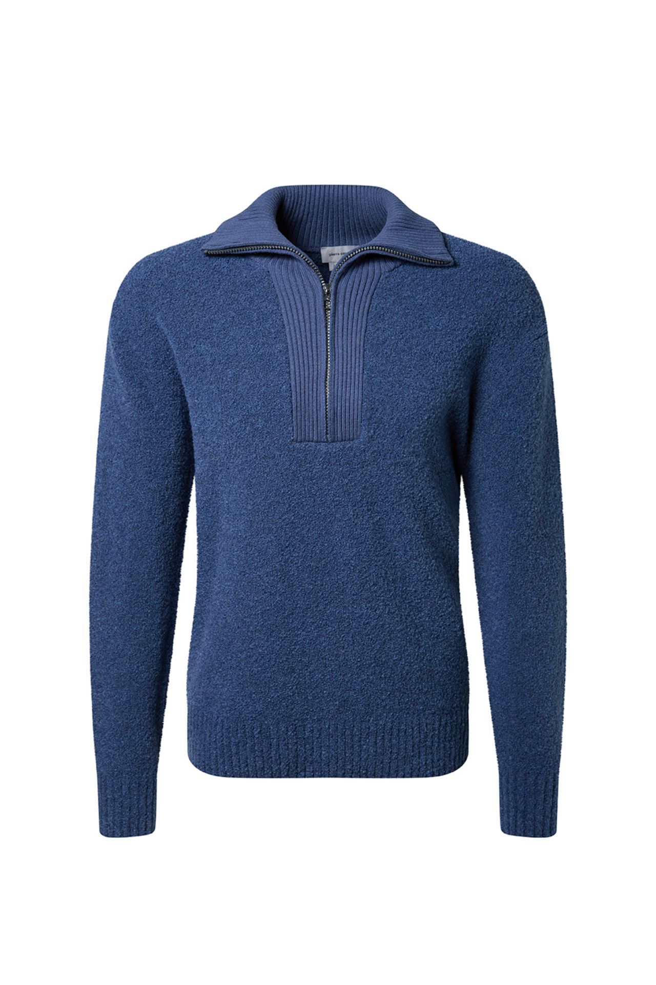 Sweter męski typu troyer w głębokim odcieniu niebieskiego, wykonany z mieszanki wełny. Miękka i ciepła dzianina sprawia, że sweter świetnie sprawdzi się w chłodniejsze dni, jednocześnie pozostając przyjemnym w dotyku i komfortowym podczas noszenia. Charakterystycznym elementem modelu jest półgolf z krótkim zamkiem, który pozwala regulować dekolt i nadaje całości swobodny, ale elegancki wygląd. Prążkowane wykończenie kołnierza, mankietów i dolnej części swetra podkreśla jego sportową linię i zapewnia dobre dopasowanie do sylwetki.
