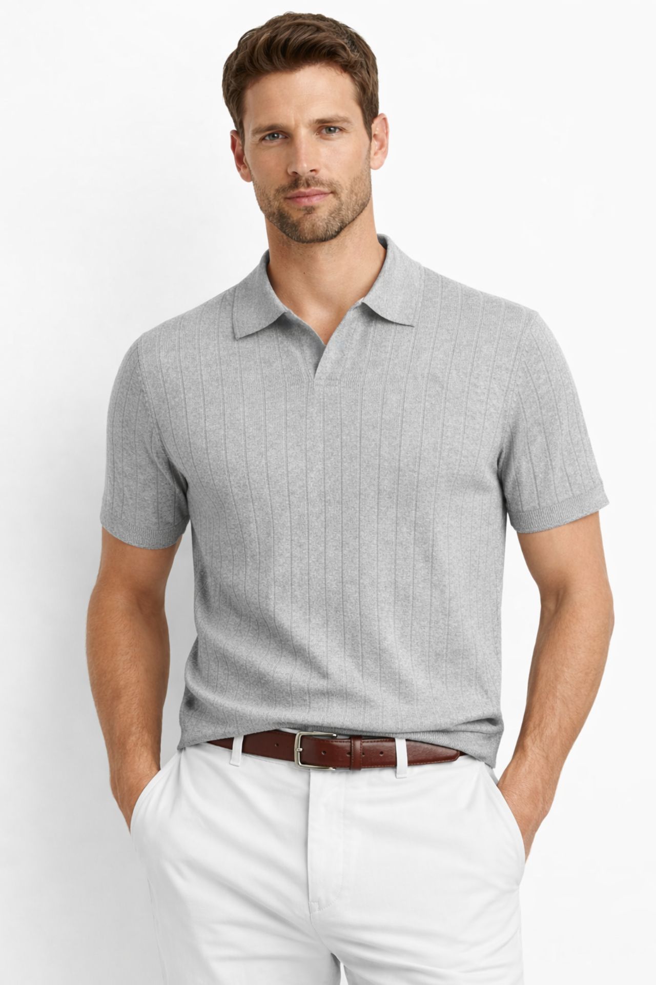 Szara koszulka polo o wyrafinowanej, pionowo prążkowanej strukturze to połączenie nowoczesnej elegancji i najwyższej jakości przędzy. Luksusowa mieszanka tencelu, bawełny, nylonu oraz dodatku jedwabiu zapewnia wyjątkową miękkość, oddychalność i naturalny połysk, jednocześnie gwarantując trwałość oraz idealne dopasowanie do sylwetki. To premium polo męskie doskonale sprawdzi się zarówno w stylizacjach smart casual, jak i w codziennym, eleganckim wydaniu, oferując komfort noszenia na najwyższym poziomie.