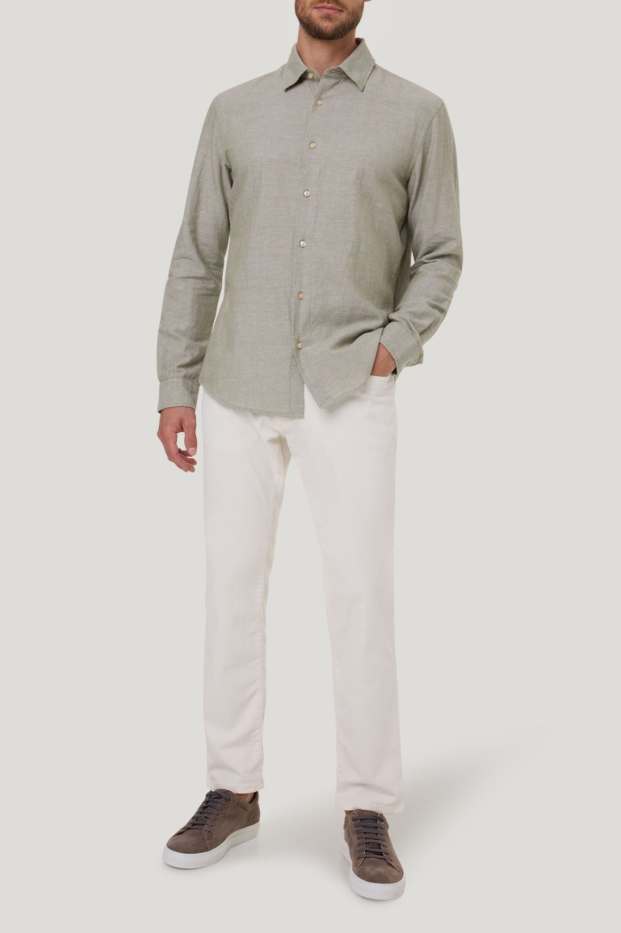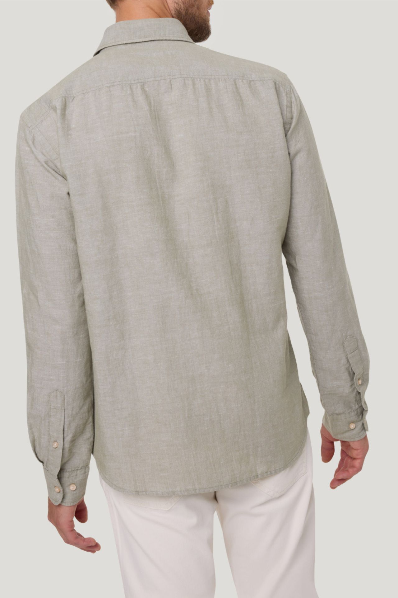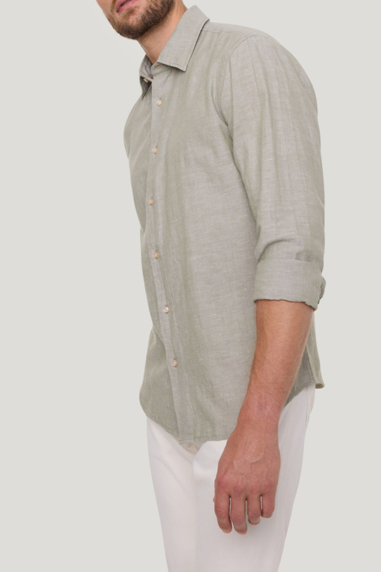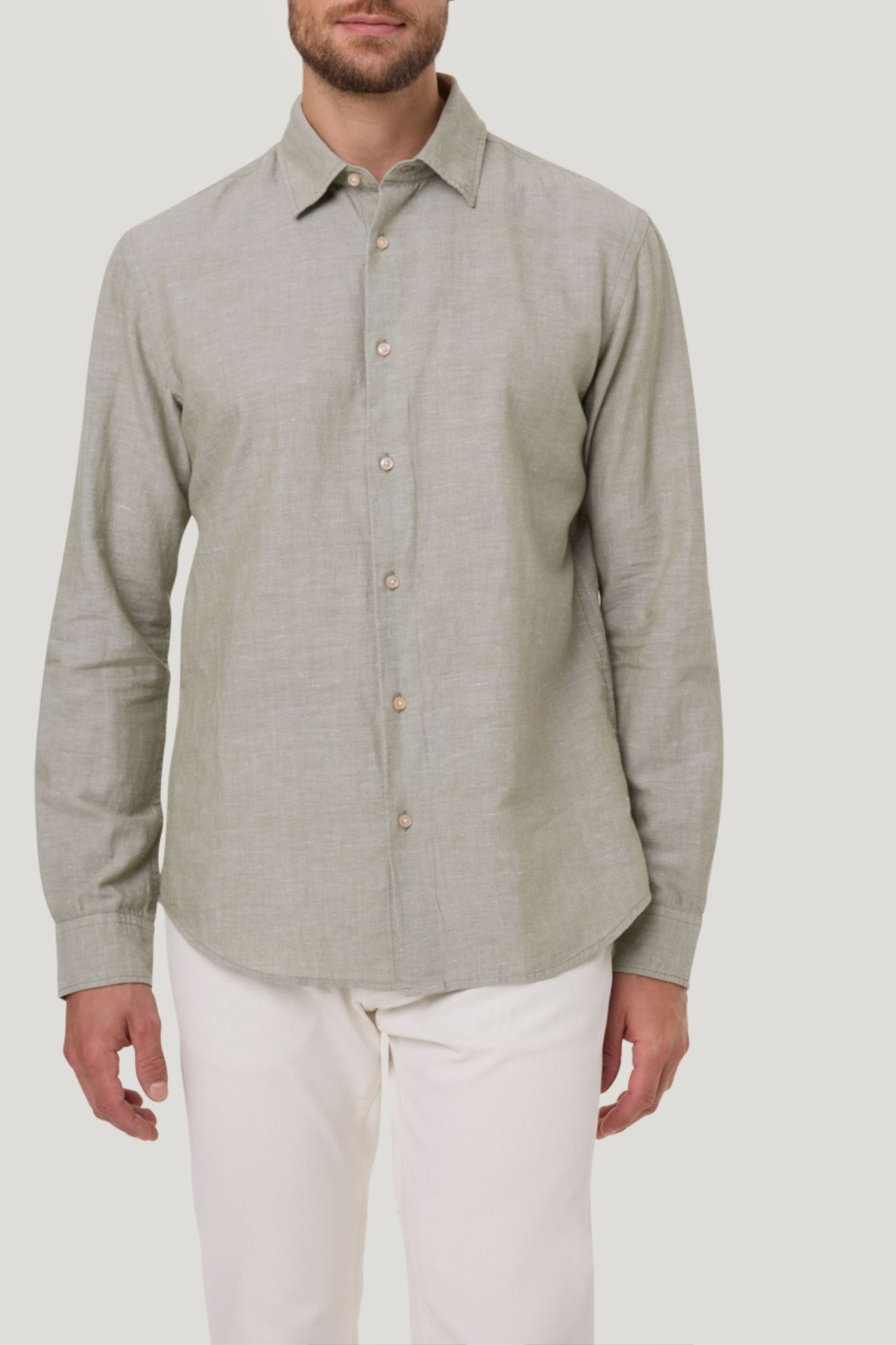 Koszula o prostym kroju, uszyta ze strukturalnej tkaniny w połączeniu bawełny i lnu w kolorze zielonym.