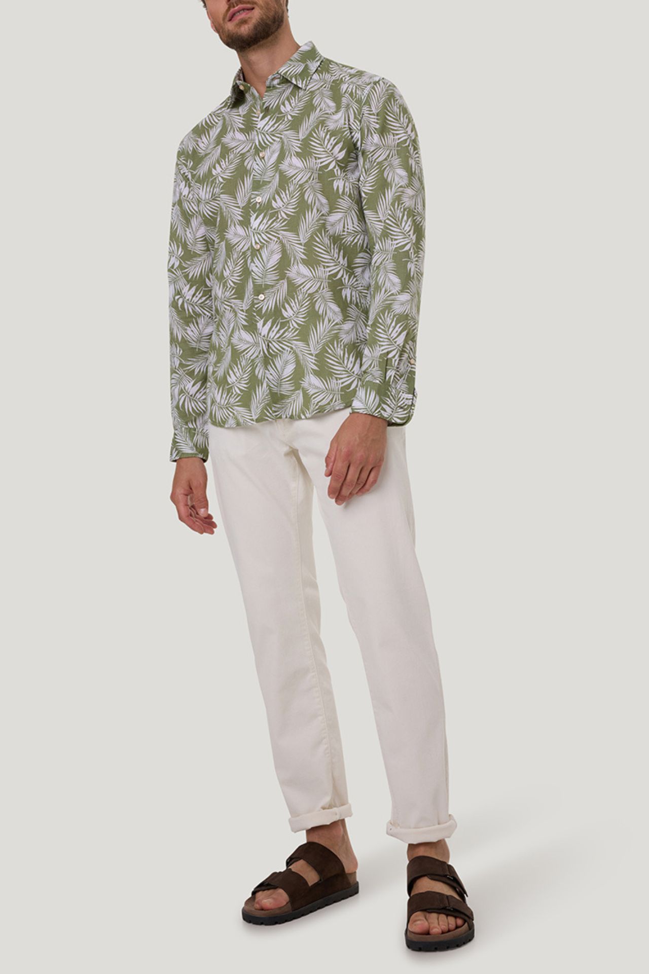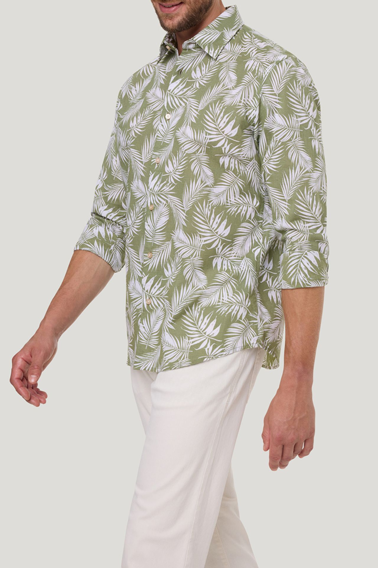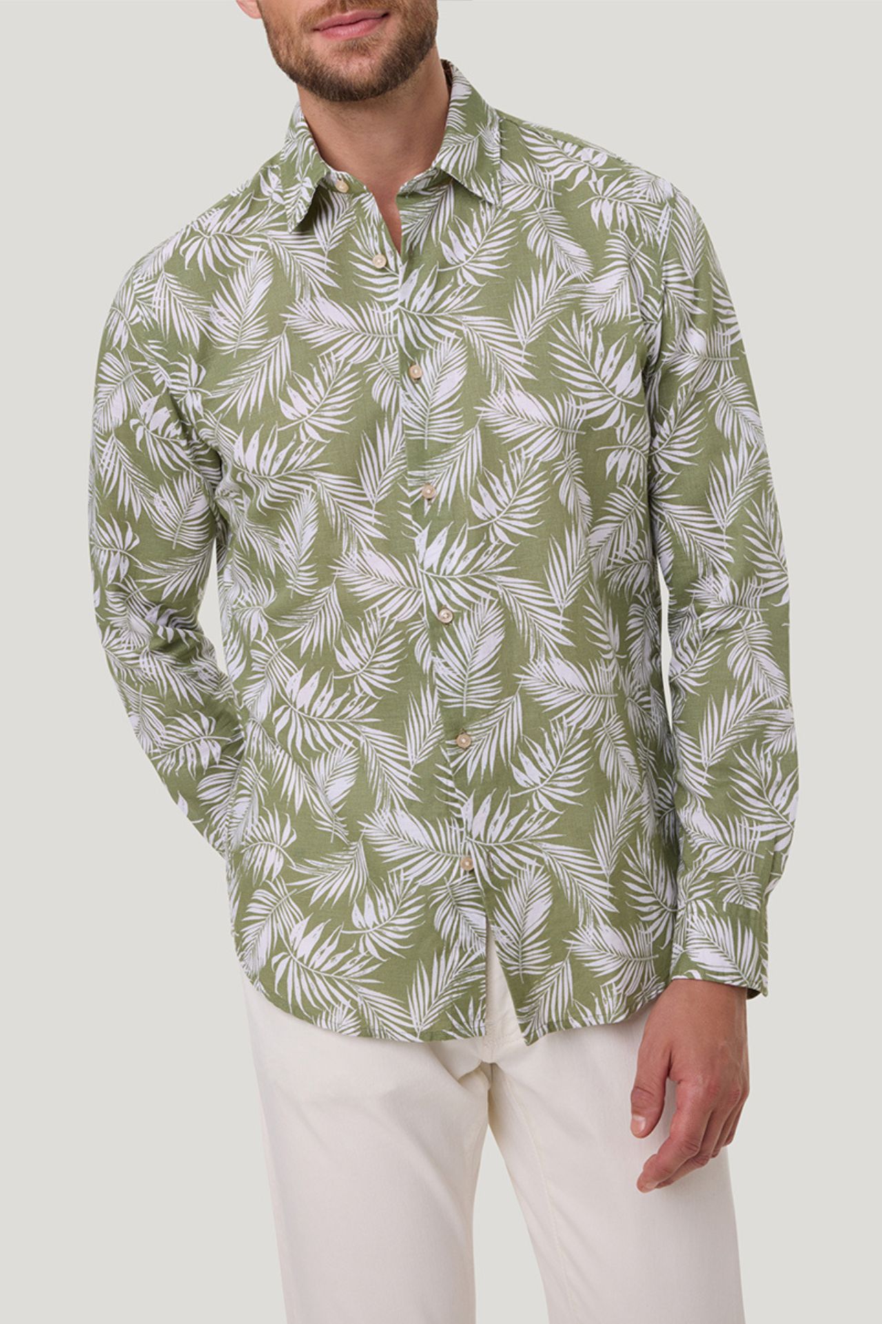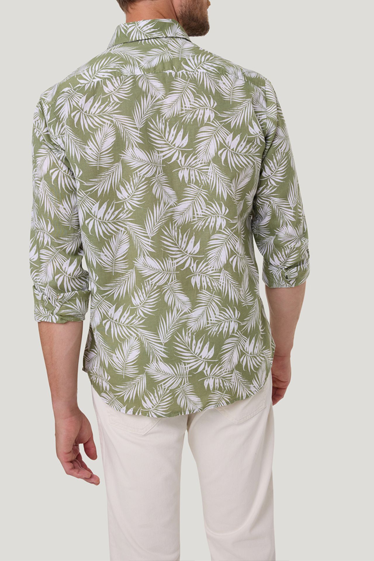 Koszula męska w kolorze zielonym z printem z motywem roślinnym to idealny wybór na sezon wiosenno-letni. Wykonana z mieszanki bawełny i lnu, zapewnia przewiewność, lekkość oraz wysoki komfort noszenia nawet w cieplejsze dni. Świetnie sprawdzi się w stylizacjach casual i smart casual, dodając im świeżości i nowoczesnego charakteru.