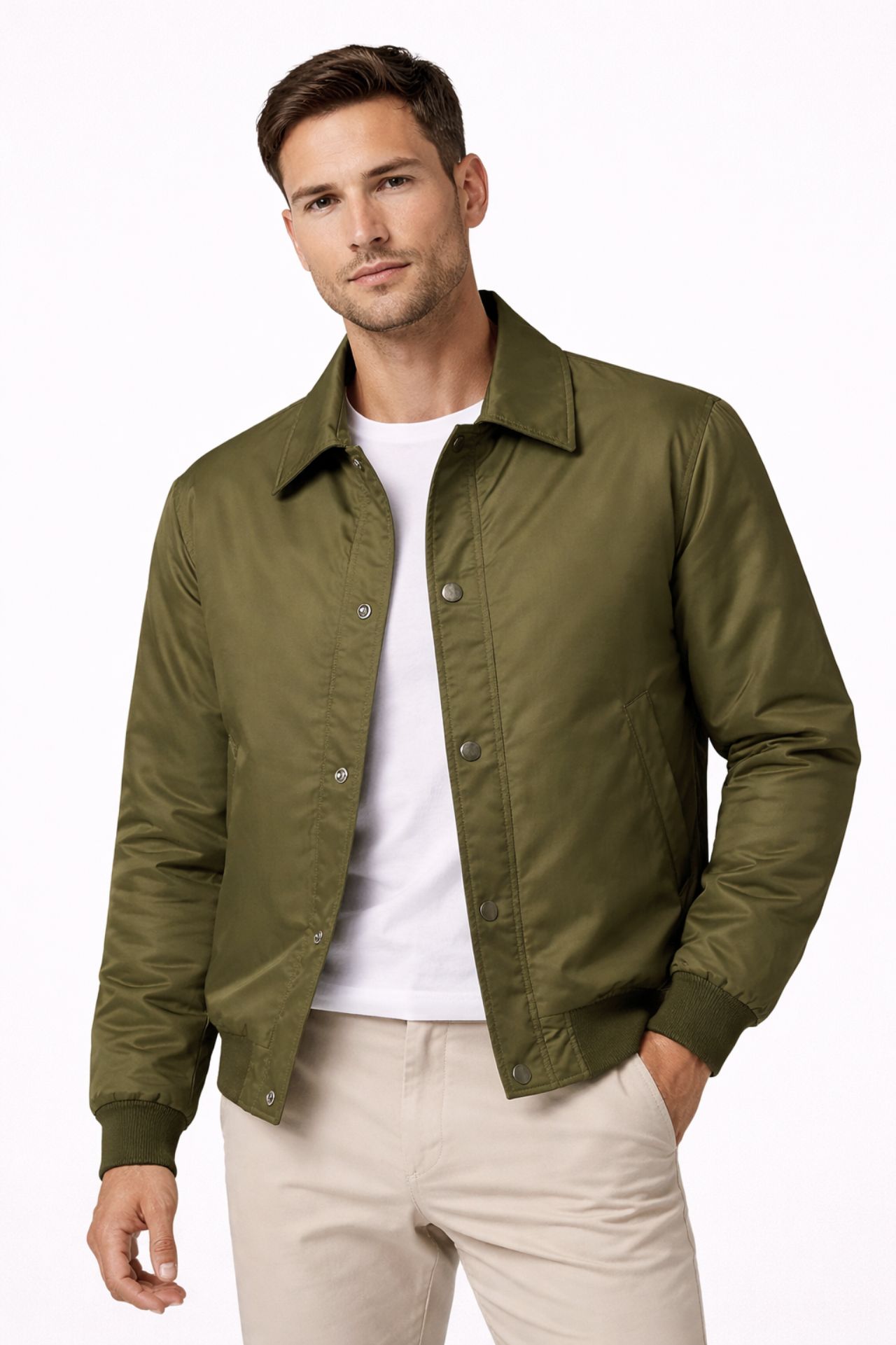 Kurtka męska w kolorze zielonym to nowoczesna propozycja premium, łącząca minimalistyczny design z funkcjonalnością na co dzień. Lekka konstrukcja, klasyczny kołnierz oraz elastyczne wykończenia zapewniają komfort noszenia i dopasowanie, a gładkie wykończenie podkreśla elegancki charakter modelu. Idealna jako przejściowa kurtka męska do stylizacji smart casual i codziennych zestawów.