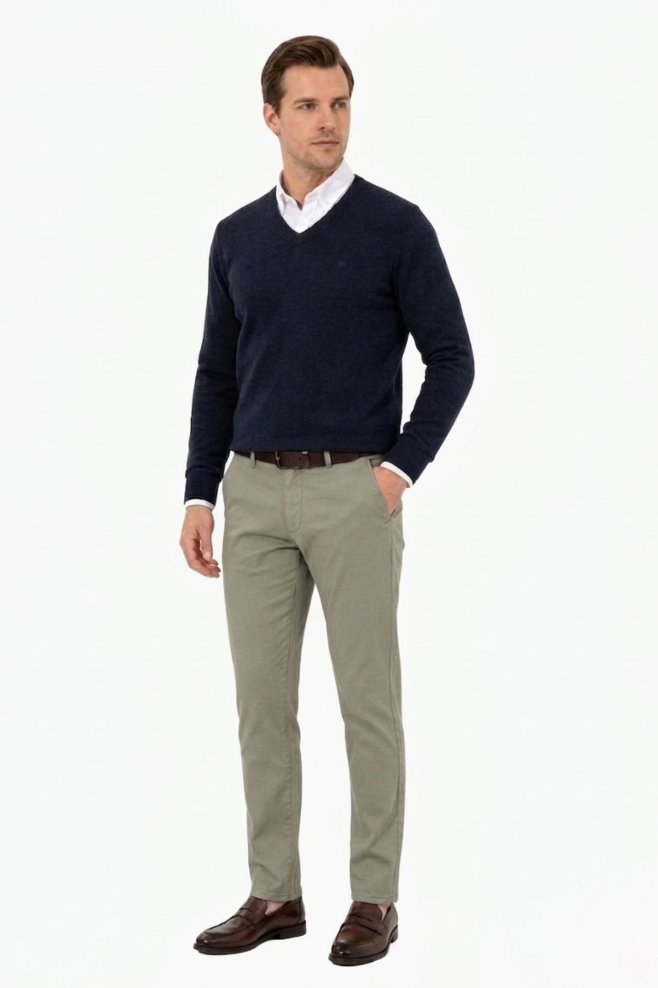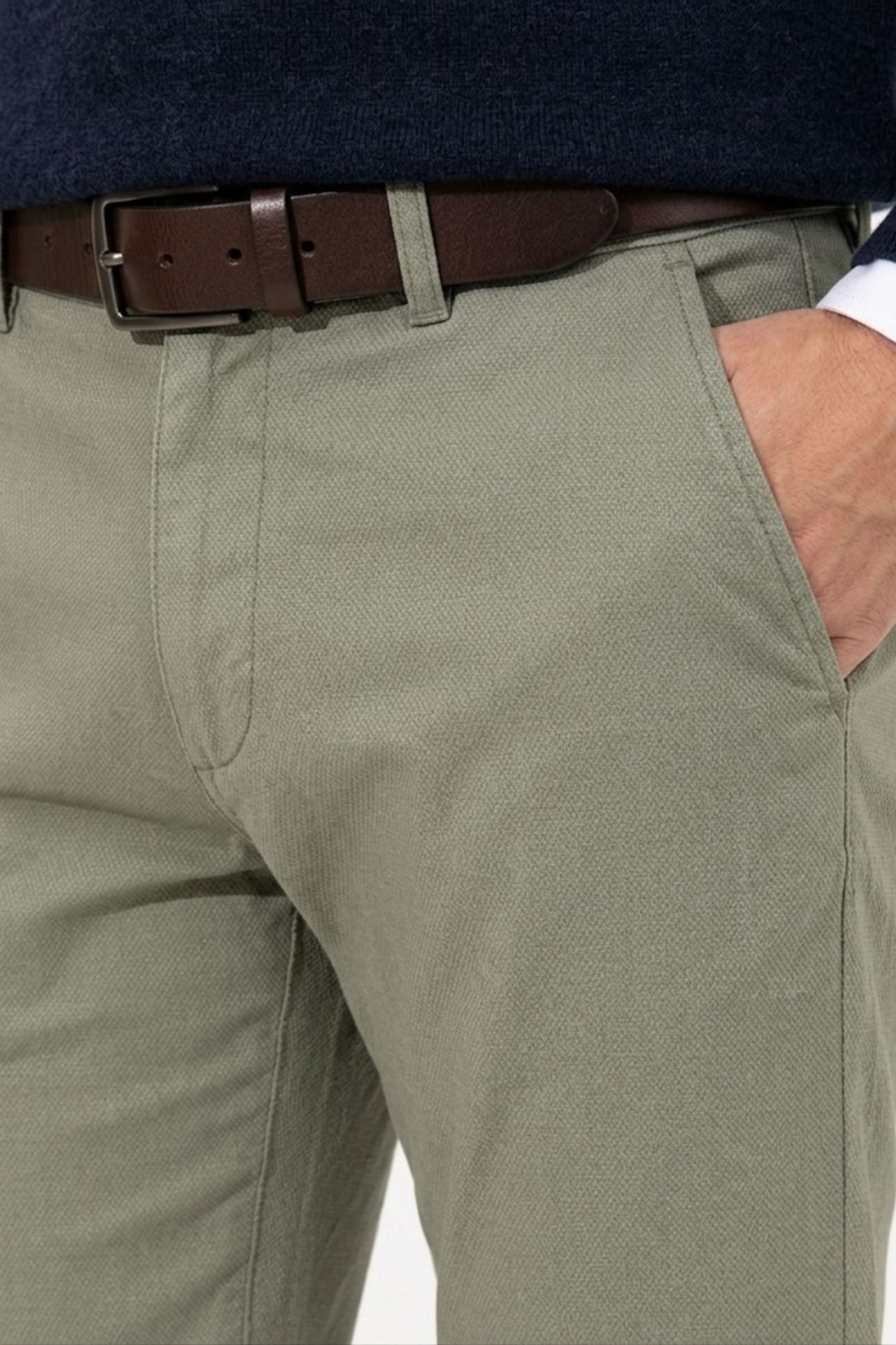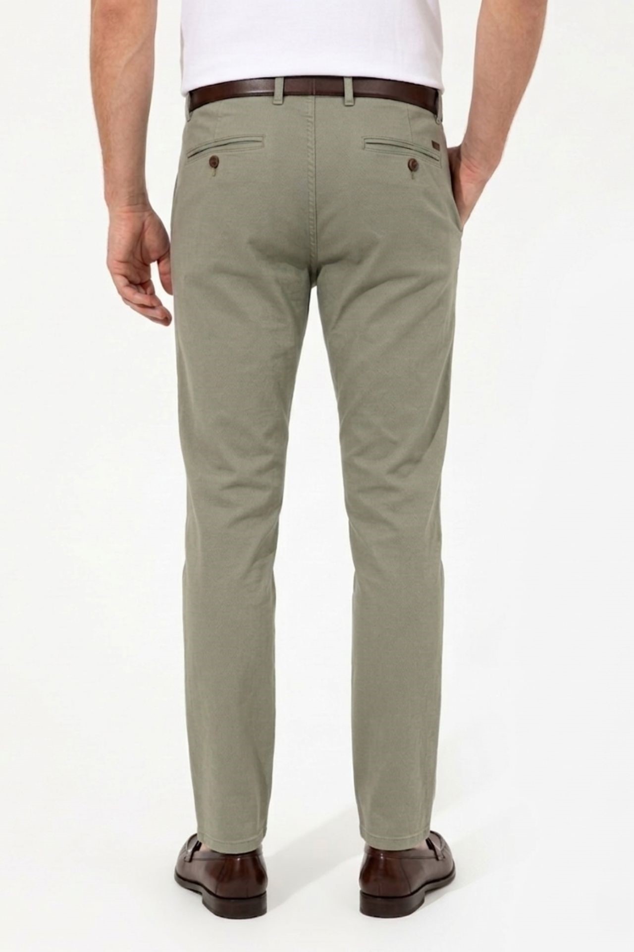 Spodnie chino w odcieniu zieleni, uszyte z wysokiej jakości bawełny o przyjemnej, lekkiej strukturze i delikatnej elastyczności, co przekłada się na komfort noszenia i naturalne dopasowanie. Starannie zaprojektowany fason z subtelnie zwężaną nogawką nadaje całości nowoczesny charakter.